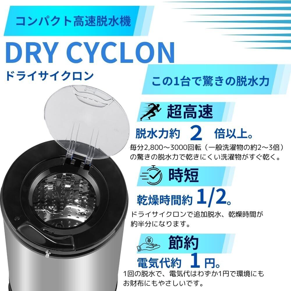 ●超高速 脱水力約2倍以上(一般洗濯機と比較) 毎分2,800~3000回転(一般洗濯機の約2~3倍)の驚きの脱水力で乾きにくい洗濯物がすぐに乾く。 ●時短 乾燥時間1/2 ドライサイクロンで追加脱水、乾燥時間が約半分になります。 ●節約 電気代約1円(1回5分間脱水) ●便利 排水は専用バケツに溜まる仕様のため、排水ホース不要。使いやすい場所へ、気軽に移動・設置できます。 ●衛生的 脱水機の素材をステンレスにする事で黒カビの発生を抑え、衛生的です。