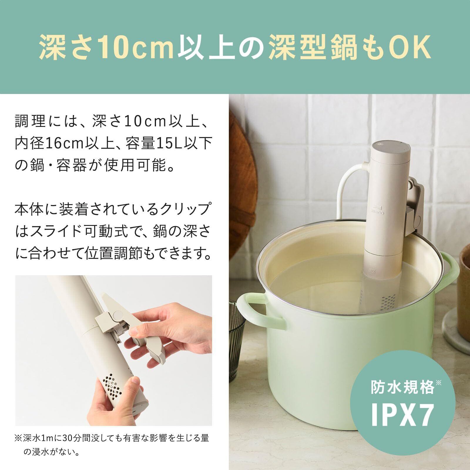 BRUNO ブルーノ コンパクト 低温調理器 グレージュ 低温加熱 ヘルシー しっとり スライド式クリップ 鍋 深鍋 浅鍋 スタンド おしゃれ かわいい 防水規格IPX7 BOE099-GRG