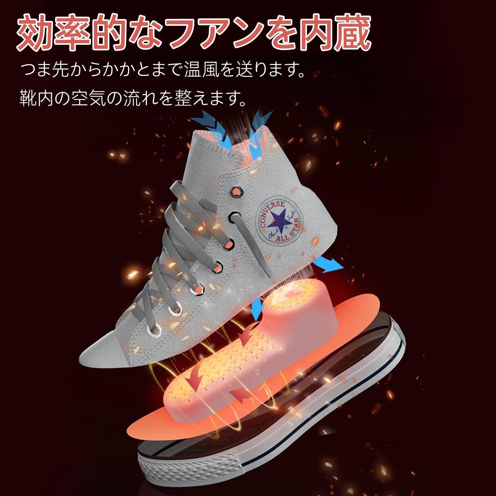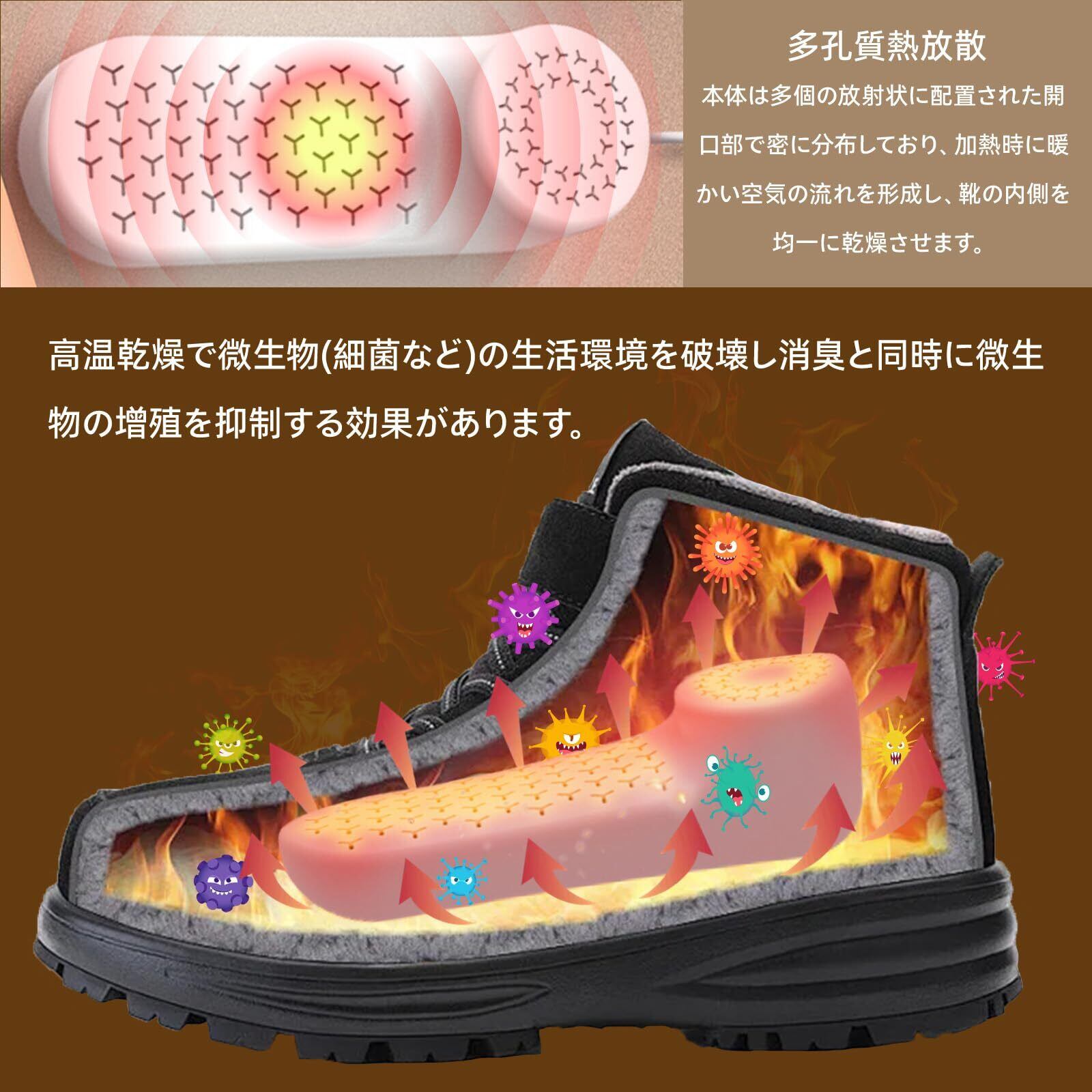 【安全性】USB微弱電力はより安全、スマートチップがPTCヒーターを制御し、靴を一定温度で加熱乾燥させます。PTCデュアルコア加熱、15秒高速加熱、すぐに熱バランスに到達します。高温で作業することで靴を乾燥・除湿するだけでなく、靴内の菌を死滅させ、殺菌・消臭の効果があります。