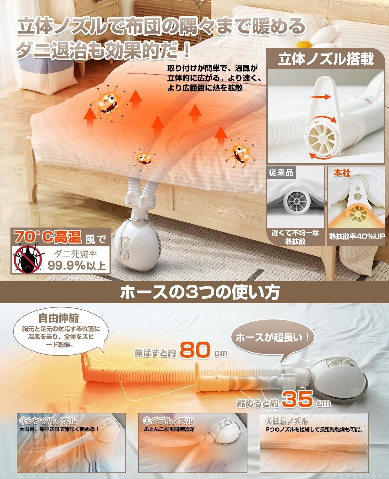 【ホースの多様な使い方・立体ノズル】:2本のホースが付属しており、取り外し・伸縮が自由自在です。2本の送風ホースで布団2枚や靴2足を同時に乾かしたり、1本のホースで大風量を集中させて素早く乾かしたり、2本のホースをつなげて遠距離乾燥もOK。ホースは最大約80cmまで伸ばすことができ、布団の隅々までしっかり暖めます。ノズルにフラップを取り付けることで、布団の中にしっかりとした空間を作り、熱を均一に素早く広げます。立体ノズルにサイドフラップが付くことで安定感がUP!