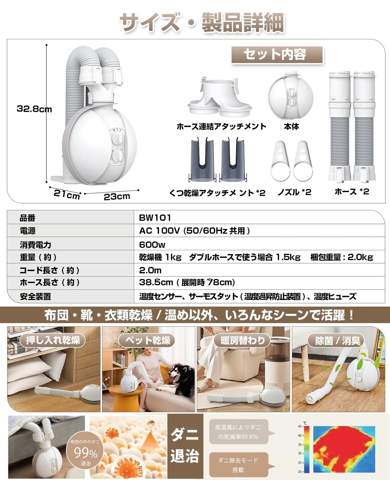 商品サイズ(cm)(ホース折りたたみ時):幅約21×奥行約23×高さ約32.8●商品質量:約2kg●電源:AC100V(50/60Hz共用)●消費電力:600W●タイマー:15・30・45・60・90・120分●コードの長さ:約2m●安全装置:温度センサー、サーモスタット、温度ヒューズ●付属品:くつ乾燥アタッチメント×2;ホース×2;ノイズ×2;
