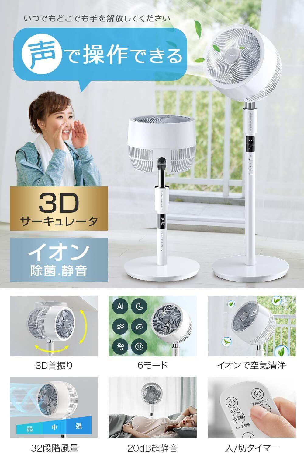 扇風機 サーキュレーター 【2025夏節電対策&音声操作&AIモード】 リビング扇風機 360度首振り 30畳 パワフル送風 DCモーター 省エネ 32段階風量調節 20dB静音 6つのモード イオンで空気清浄 切/入タイマー 高さ調整可能 アロマ機能 せんぷうき リモコン付き さーきゅれーたー オールシーズン 暑さ対策 冷暖房 換気/空気循環/部屋干し/除塵 梅雨 除湿 PSE認証済