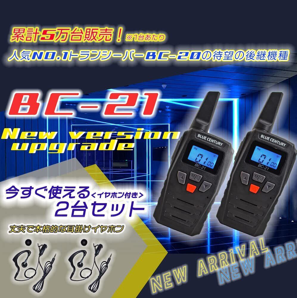 BLUE CENTURY 国内メーカー ブルーセンチュリー 特定小電力 トランシーバー BC-21 & 耳掛けイヤホンマイク ベルトクリップ 付属 インカム 技適マーク有 総務省技術基準適合商品 (2台セット)