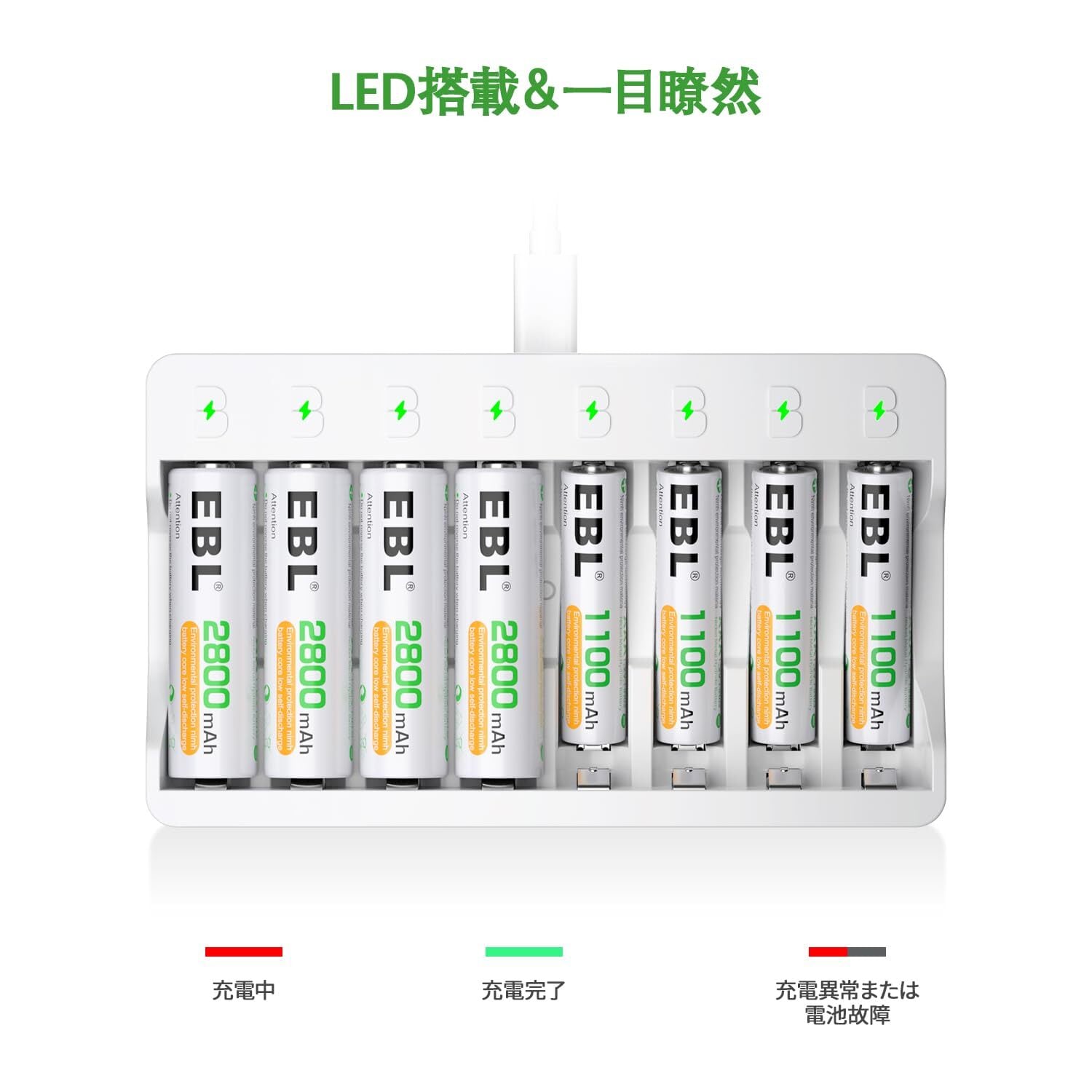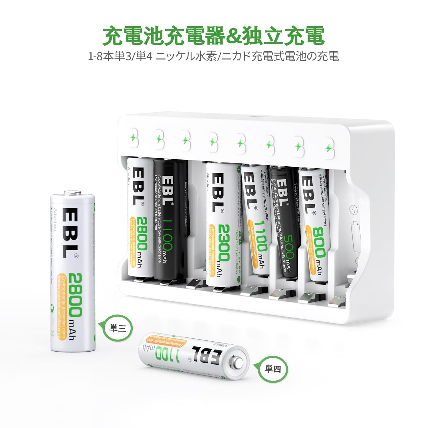 EBL 電池充電器 単3 単4 ニッケル水素/ニカド充電池に適用 USB-Cケーブル充電 電池の充電1-8本自由対応可能 電池じゅうでんき単体 ニッカド充電器
