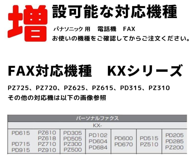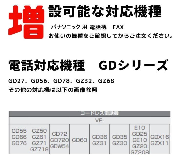 パーソナルファクス、コードレス電話機用の増設子機です。使用している親機により利用できる機能が異なります。 ※無線通信方式1.9GHzを使用。2.4GHz使用機器ではすべて使用できません。 増設可能な親機(2018年6月現在) ■パーソナルファクス KX-PD615/KX-PD715/KX-PD915/KX-PZ610/KX-PZ618/KX-PZ710/KX-PZ910 KX-PD305/KX-PD505/KX-PD300/KX-PD500 KX-PD102/KX-PD604/KX-PD684 KX-PD600/KX-PD670 KX-PD515/KX-PZ510 KX-PD205/KX-PD285/KX-PZ200 ■コードレス電話機 VE-GD55/VE-GD66/VE-GD76/VE-GZ50/VE-GZ61/VE-GZ71/VE-GZ718 VE-GD72/VE-GD720/VE-GDW54 VE-GD60 VE-GD36/VE-GZ31 VE-GD35/VE-GZ30 VE-E10/VE-GD25/VE-GE10/VE-GZ20/VE-GZ208 VE-GDX16/VE-GZX11 VE-GDS02