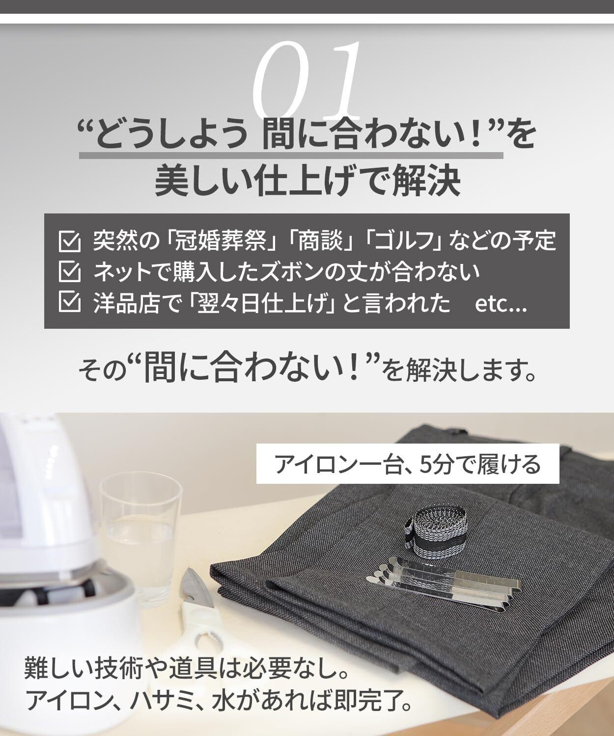 【アイロン1つで5分仕上げ!】針も糸も不要の裾上げテープ!アイロンとハサミ、水だけで、ズボンやスカートの調整が簡単にできます。2.5cm幅のテープが折り目を美しく仕上げ、見た目もプロ並みに。急な予定でも5分で仕上がるから、忙しい日々にぴったり!