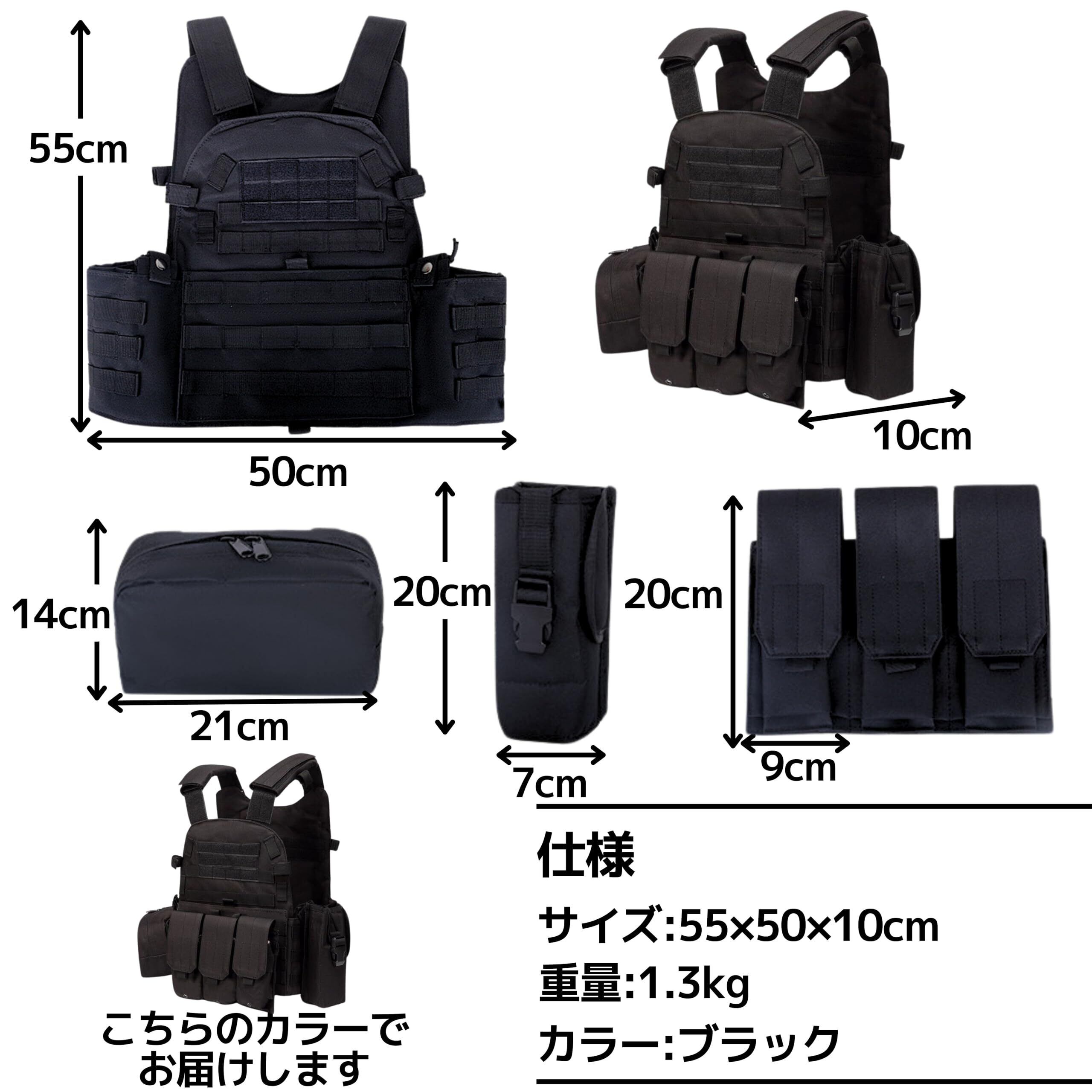 【多機能ポーチ搭載】 3連マガジンポーチ、無線機ポーチ、多目的ポーチを標準装備。すべてのポーチは着脱可能で、必要に応じて位置を変更できます。サバゲーやミリタリーで必要なアイテムを効率よく収納できます。