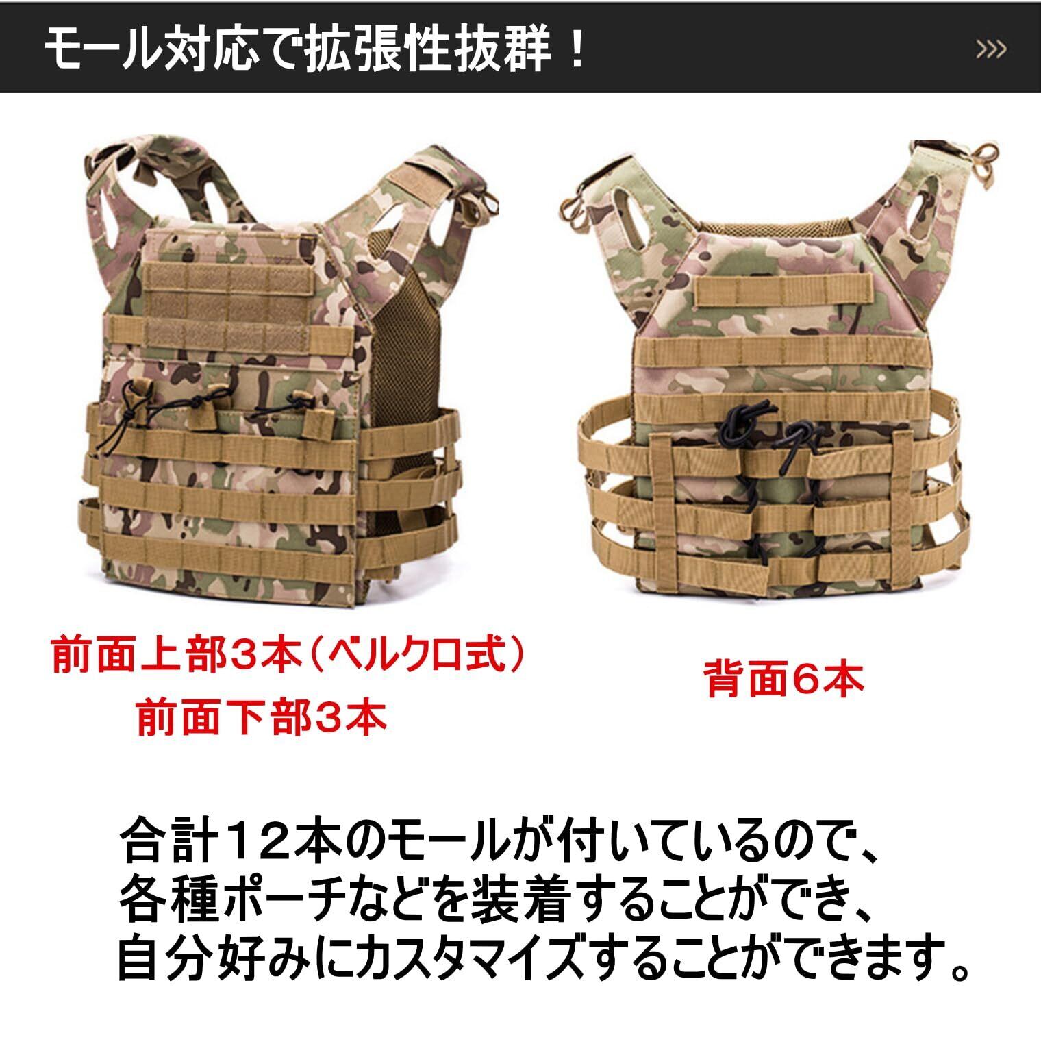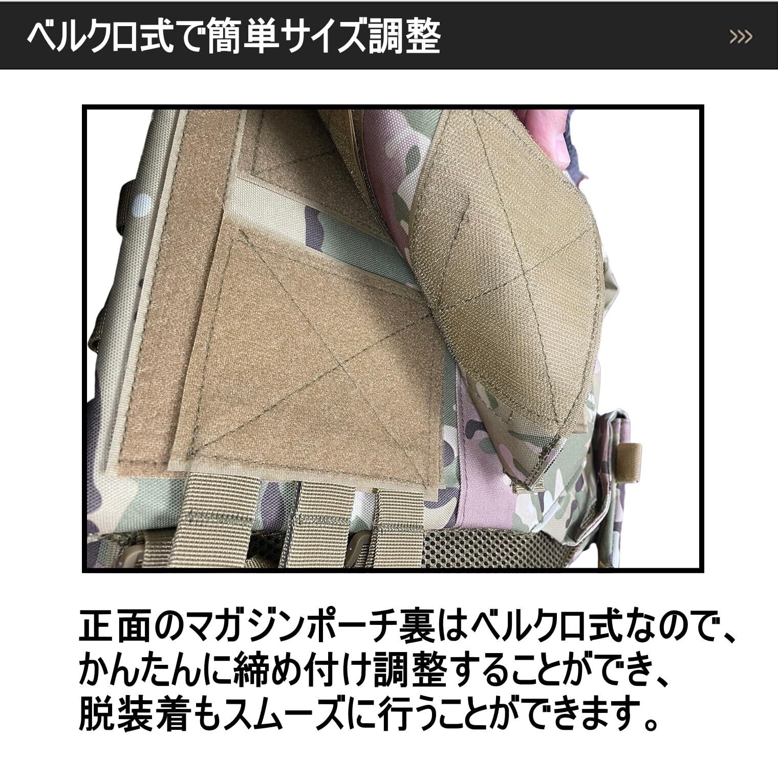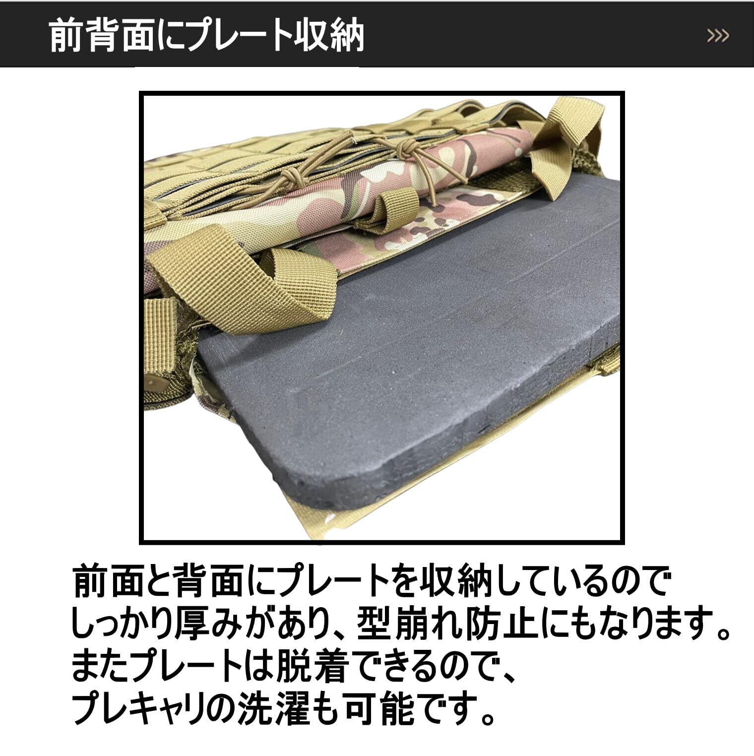 【 ベルクロ式で簡単サイズ調整 】 正面のマガジンポーチ裏はベルクロ式なので、かんたんに締め付け調整することができ、脱装着もスムーズに行うことができます。また肩もベルクロストラップでサイズを調整することができます。さらにサイドベルトはゴムで自由に調整することができます。 【 モール対応で拡張性抜群!ポーチやパッチの配置も自由 】 前面上はベルクロ式モールなので、ポーチやパッチを装着することができ、前面下のマガジンポーチにベルクロが付いているのでハンドガンマガジンポーチなど装着することができます。さらに背面にもモールが6本ついていて、各種ポーチなどを装着することができ、自分好みにカスタマイズすることができます。 【 前背面にプレート収納 】 前面と背面にプレートを収納しているのでしっかり厚みがあり、型崩れ防止にもなります。またプレートは脱着できるので、プレキャリの洗濯も可能です。 【 オックスフォード 高密度強化ナイロン 】 オックスフォード高密度強化ナイロンを使用しているので、十分な強度があり、耐衝撃性・防水性に優れています。