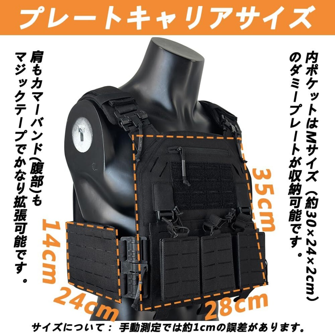 【タクティカルベストサイズ】プレートキャリア、マガジンポーチをセットにしたタクティカルベストです。(マジックテープで調整可)プレキャリの全てのプレートが着脱可。サイズ: 35 CM x 28 CM(長さ x 高さ)・重量:約1㎏。モール三連マガジンポーチのサイズ: 23 CM x 10 CM x 3CM(長さ x 高さ x 厚み)・重量:約0.12㎏。