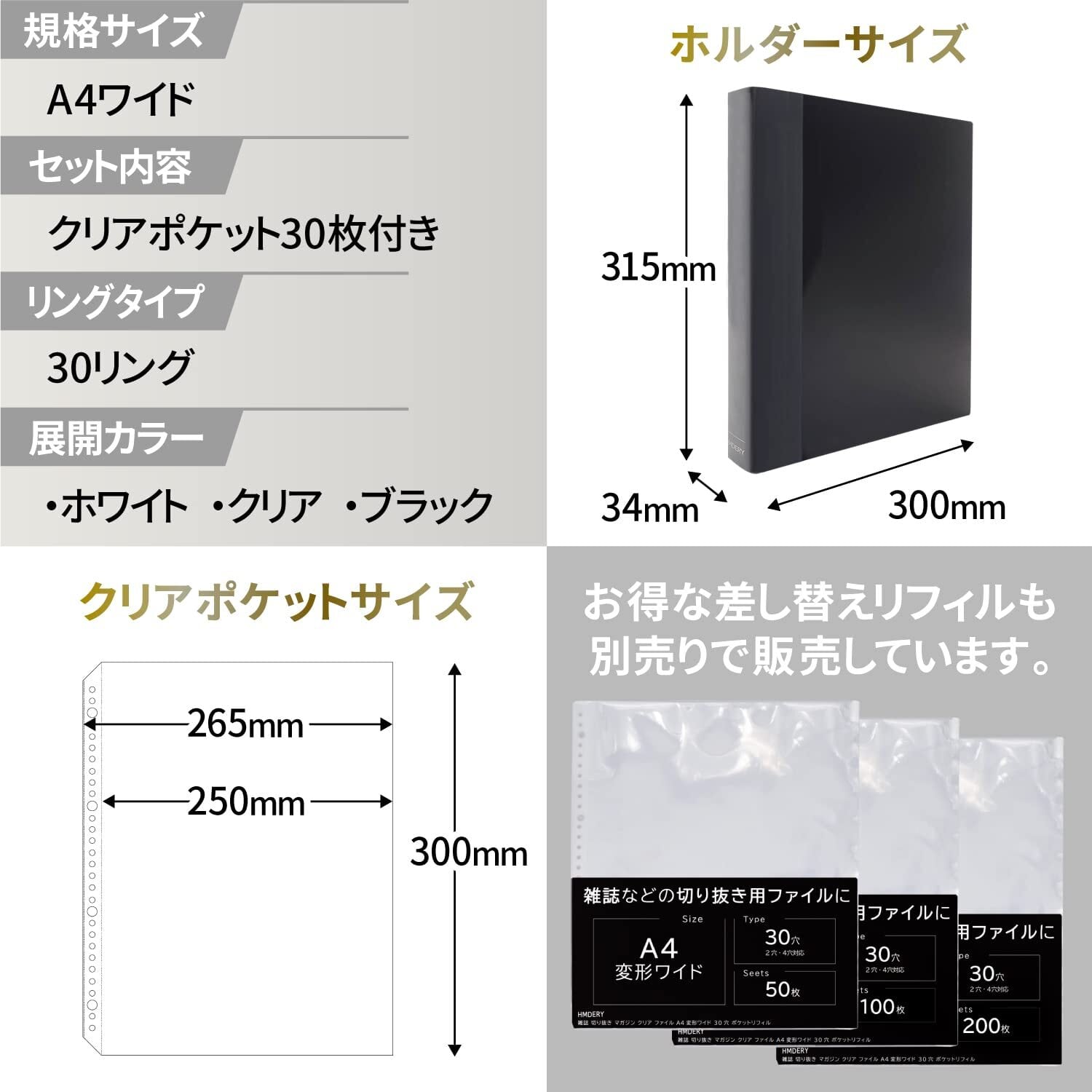 【カラー】クリア 【サイズ】マガジンファイル:サイズ:縦315mm×横300mm×背幅34mm / A4変形ワイド / 30穴リング式バインダー ・ クリアポケット:縦300mm×横265mm(収納サイズ:縦300mm×横250mm) A4変形ワイド / 30枚入り/30穴(2穴、4穴リング対応) 【おススメの収納用途】アイドル誌 アニメ ファッション 新聞 映画 コスメ 料理 音楽 雑誌などにその他にも、A4ファイルには入らない厚手資料の書類整理や、DVDやCDの初回特典グッズやチラシ、サイン、ポストカード、フライヤー、年賀状やお手紙の保存などにも使えます。