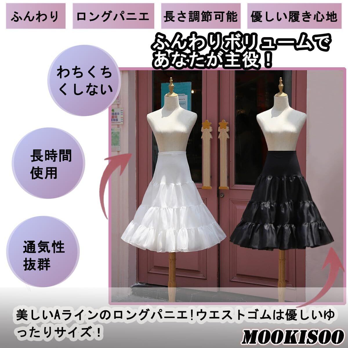 MOOKISOO ロングパニエ 50~60cm 長さ調整可能 Aライン ボリューム スカート レディース かわいい ふんわりボリューム チュチュスカート ロリータ ゴスロリ コスプレ 2層構造 3段フリル 白 黒