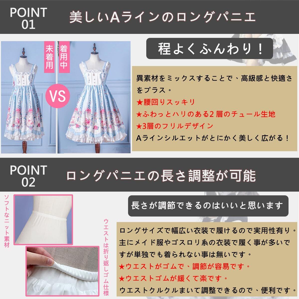 【 ちょうどいいボリューム感】パニエを使用することにより、スカートを広げ、シルエットを美しく見せることができます。ロングタイプですが、ウエスト部分を折って長さを調節することができる。ウエストゴムが緩くて楽です。2層のチュールレースは張りがあり綺麗に広がります。ちょうど良い広がり方でした。丈長:50~60cm調整可、ウエスト約52~92cm、ヒップ約60~90cm。