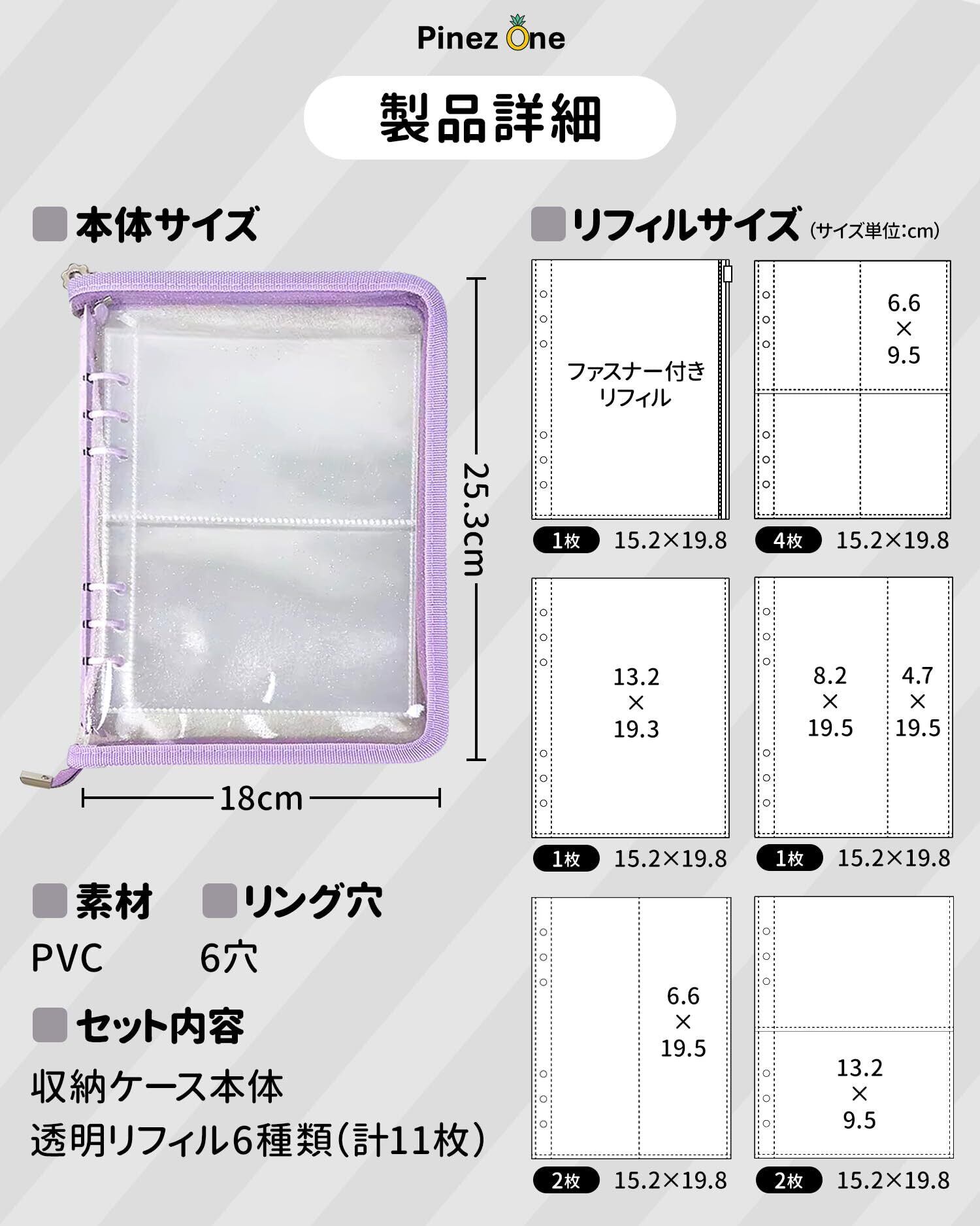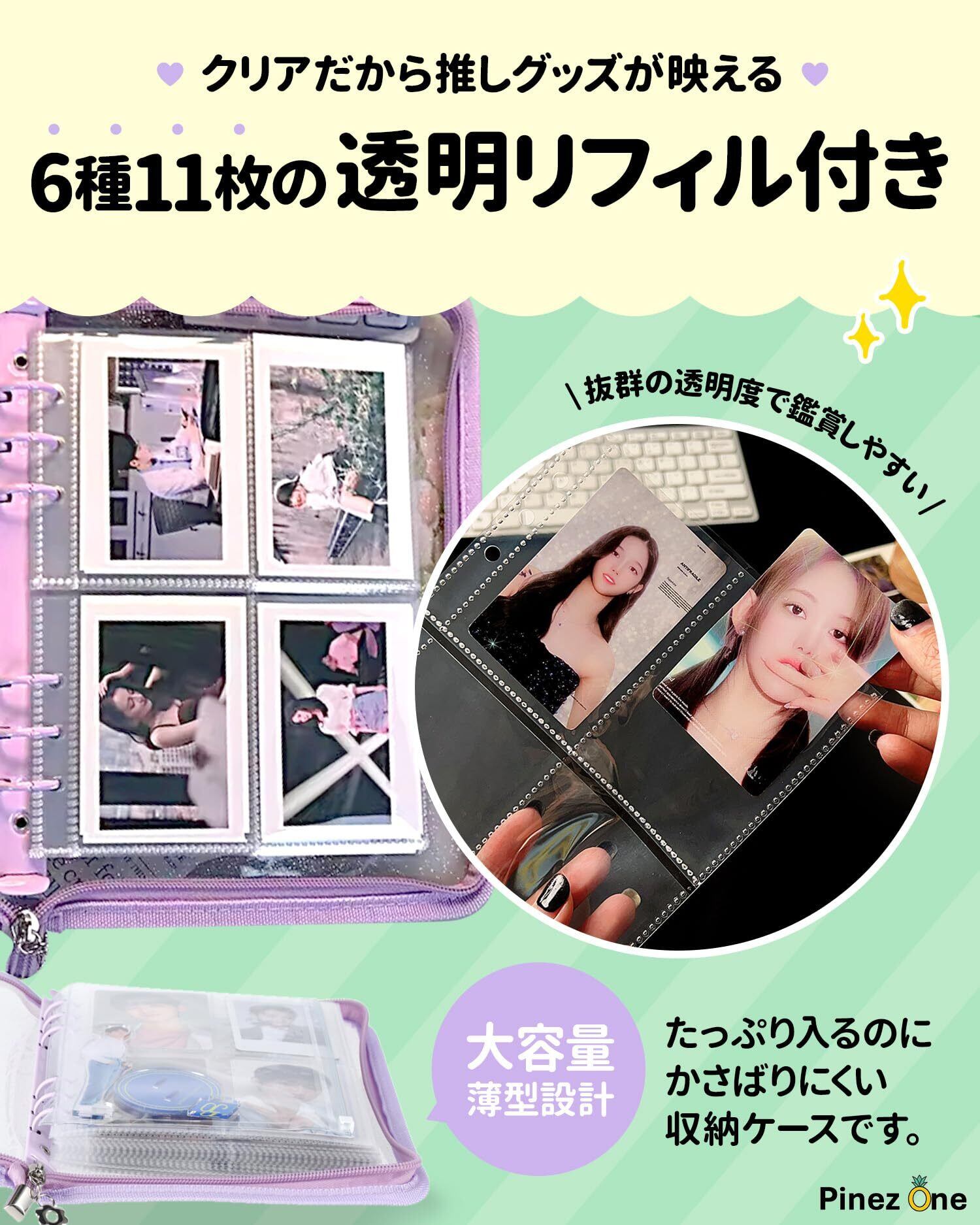 【しっかり保管で中身が飛び出さない】 PVC素材で丈夫なので大切なコレクションを汚れや傷、埃から守ります。使いやすさとデザイン性を兼ね備えた収納ケースで、あなたの大切なアイテムを収納します。 6穴リングでしっかりとページを固定、別売りのリフィルをプラスしていけば、大容量のコレクション保管ができます。厚さが出てもファスナーが閉まるよう、外側は少し大きめに作ってあります。外側はキラキラのラメ仕様ファスナーは花の引手でとってもキュート