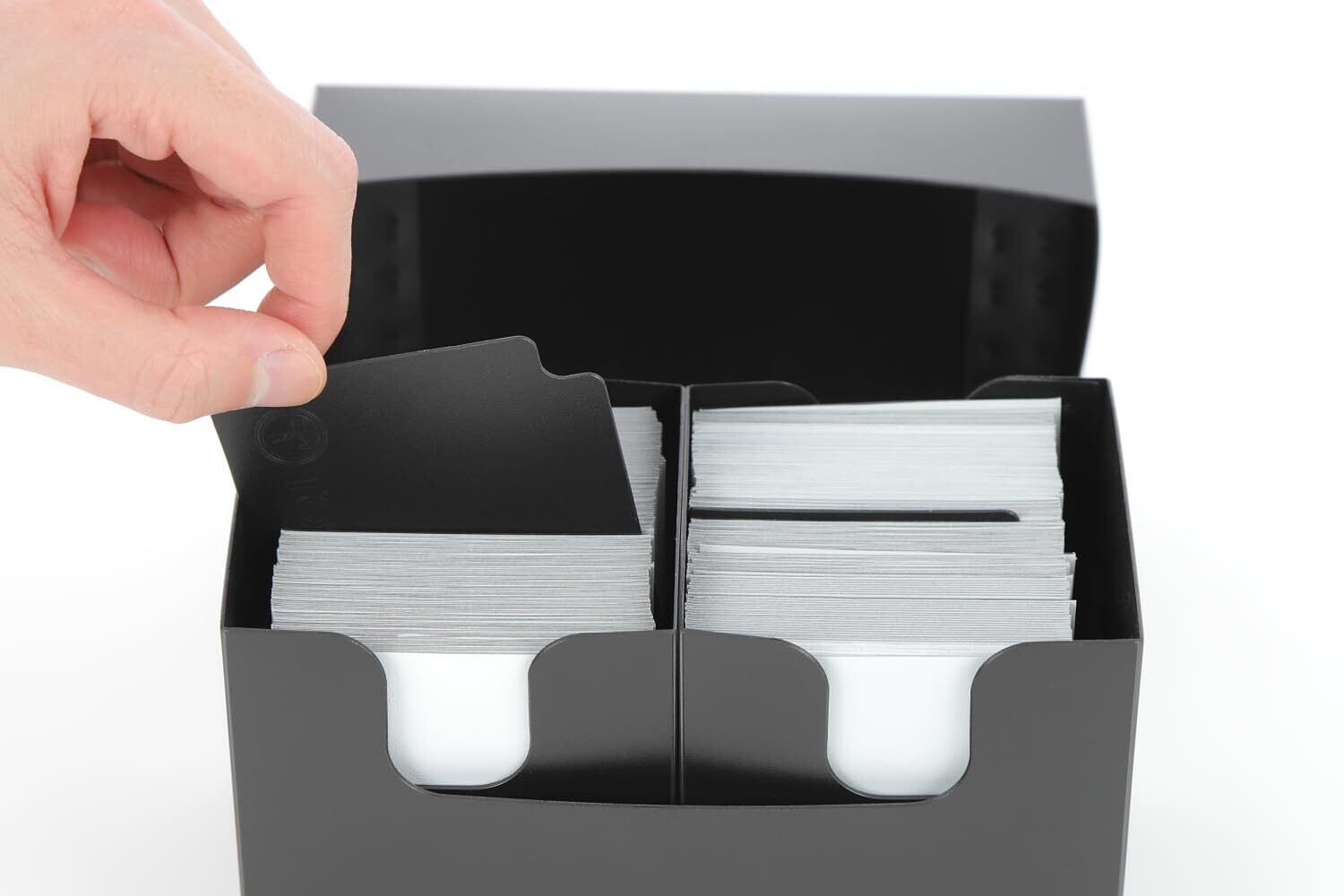 ・1ブロックに入る量は2重スリーブで100枚程度、合計で200枚ほど収納可能 ・セパレーター2枚付属で、60枚x4ブロックに分けることも可能