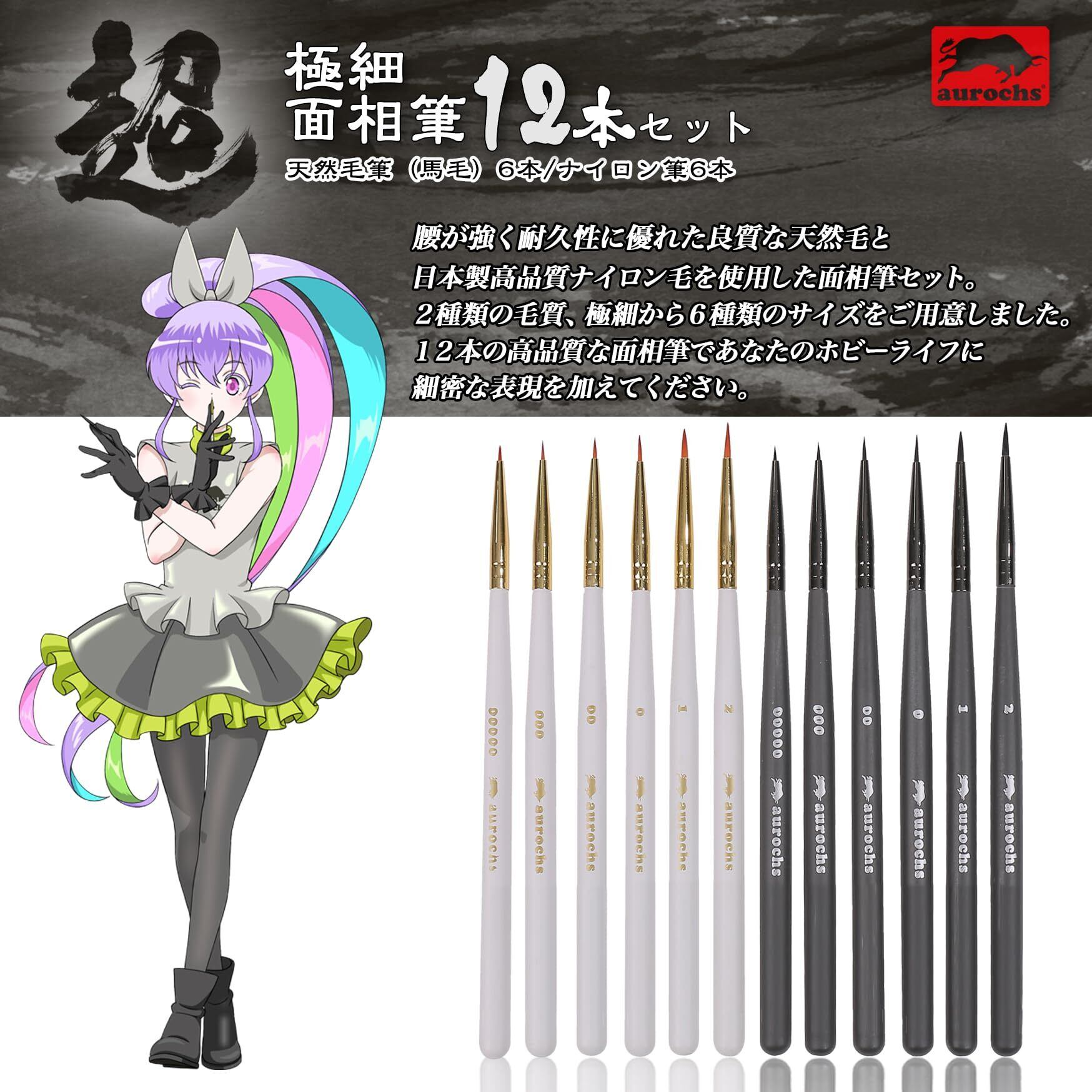 aurochs 極細面相筆12本セット 天然馬毛筆6本/ナイロン筆6本 ペイント プラモデル フィギュア 水彩画 アクリル画 日本画 デザイン ネイル