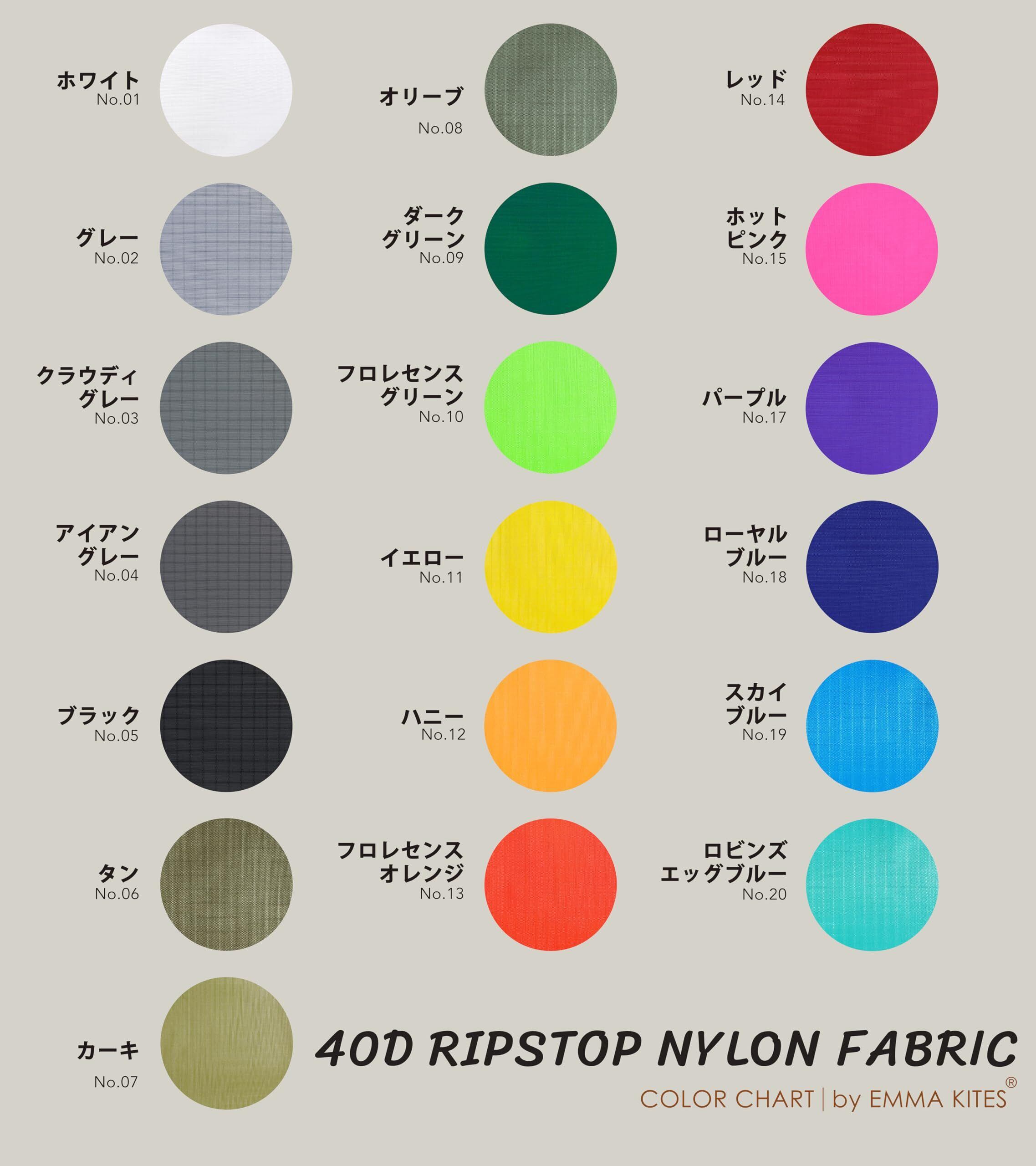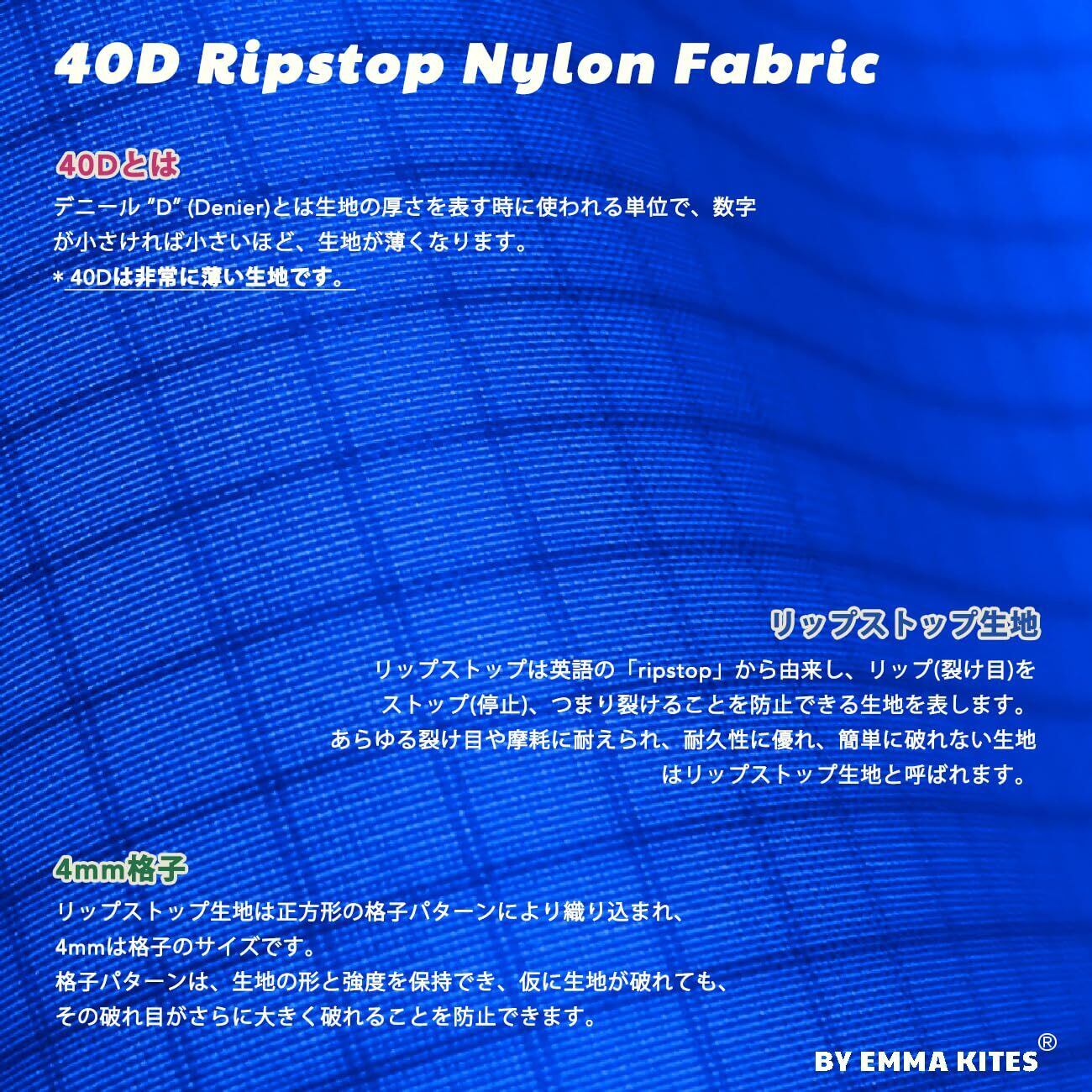 emma kitesの40Dリップストップナイロン生地。リップストップナイロン生地は高強度で軽く、優れる撥水効果と耐久性を持ち、非常に薄くて加工しやすく、コンパクトで折り畳む可能になり、各種手作りとDIY作業、ハンドメイド、修理&交換、アウトドアとインテリア全般使用に適合します。