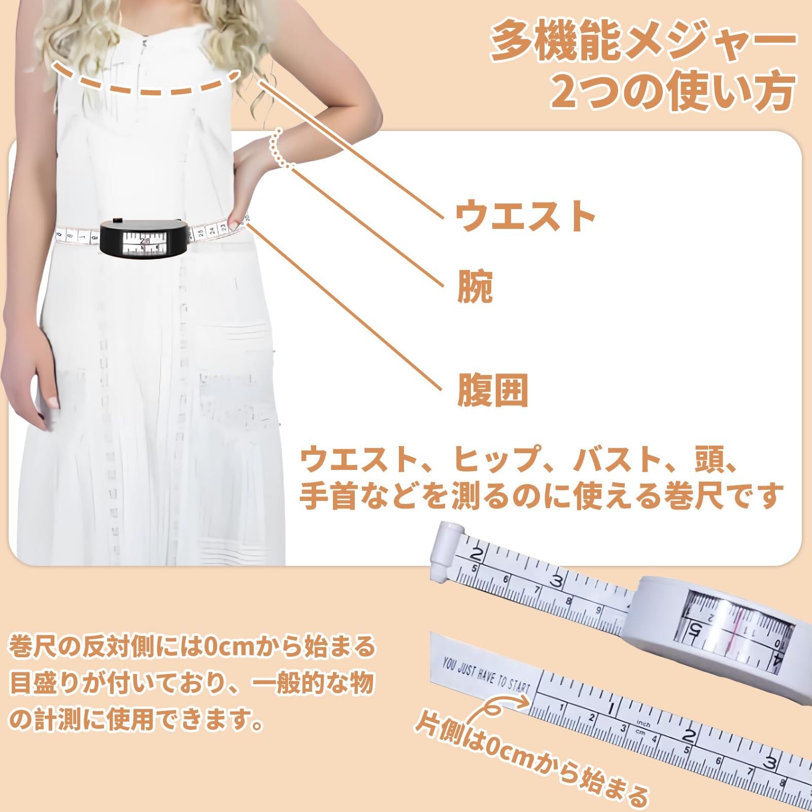 【一般物も周囲の測定もできる】巻き尺は巻いて片手で操作できるので、一人でも体のサイズを測ることができます。巻尺には一辺5cmからの目盛りがあり、のぞき窓から巻尺の湾曲部分も含めた正確な寸法を確認できます。追加の計算は必要ありません卷尺の反対側には0cmから始まる目盛りが付いており、一般的な物の計測に使用できます。
