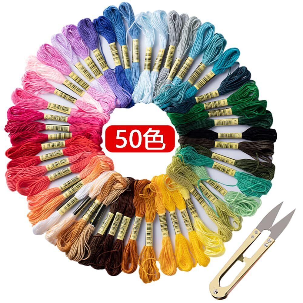 アズキホーム 刺繍糸 初心者向け カラフル 縫い糸 手芸用糸 刺しゅう糸 クロスステッチ 8m 専用ハサミ付き (50色セット)