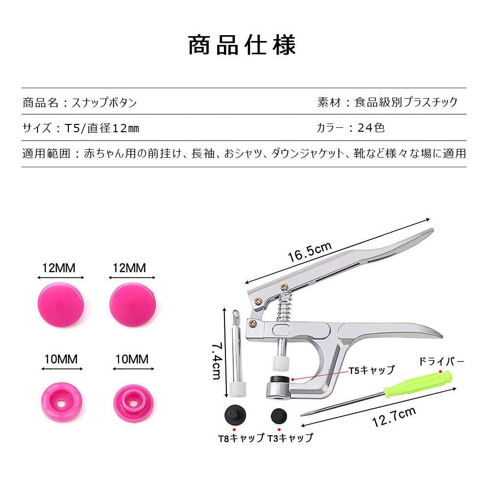 【商品仕様&セット内容】スナップボタン材質:树脂、プライヤー:アルミ。スナップボタンサイズ:直径約12mm(T5)。ボタンx360、プライヤーx1、金属製ロッドx1、プラスチックキャップx3、スクリュードライバーx1、千枚通しx1、ピンセットx1。