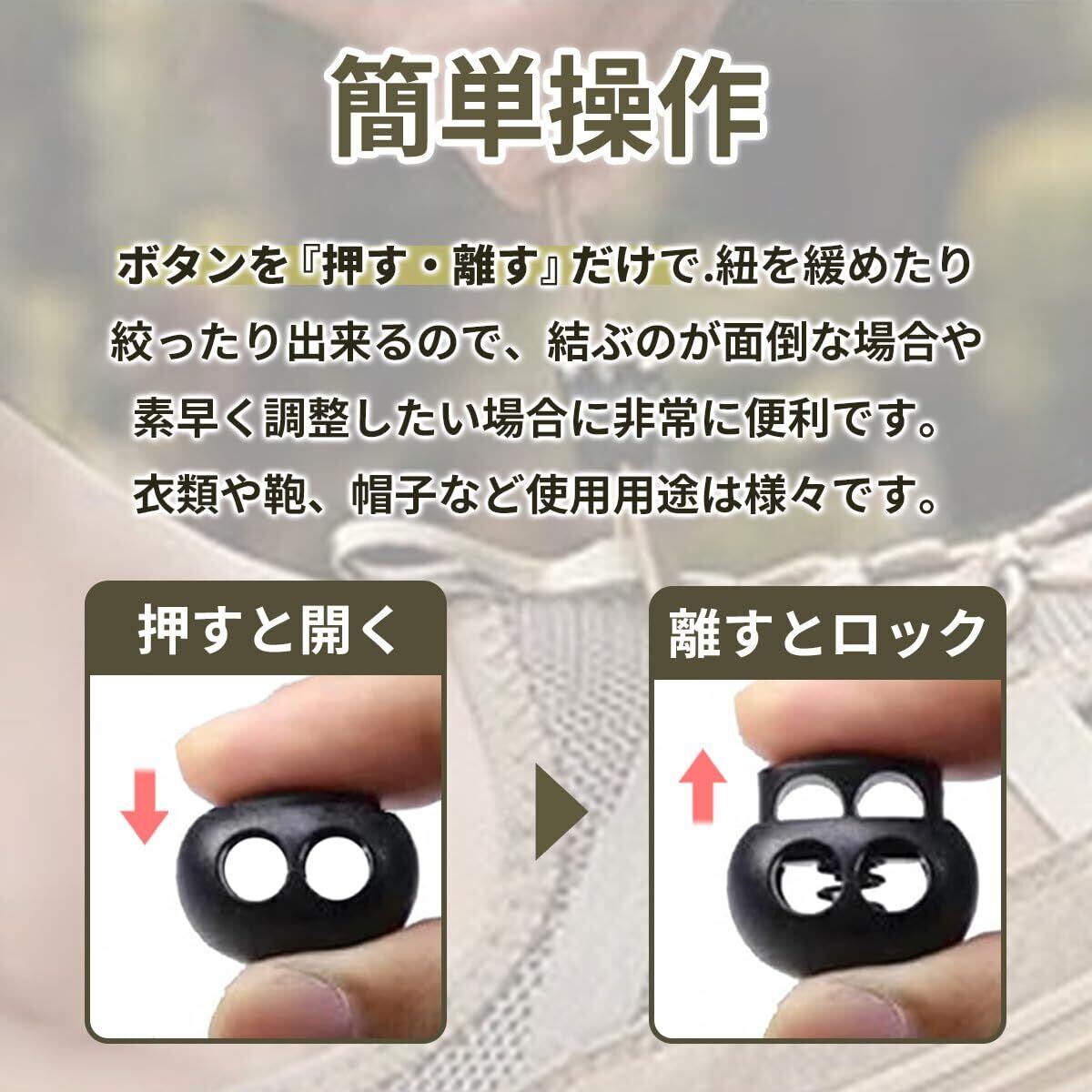【使用例】 リュックサック:リュックの開閉部分に使用して、簡単に開け閉めができるようにします。 衣類:ジャケットやパンツの裾のゴム部分に使用し、フィット感を調整します。 帽子:ヒモ部分を固定する事で、頭から帽子がズレ落ちるのを防ぎます。 手芸:手作りのバッグやポーチなどの紐の調整に活用します。 その他にも、アイデア次第で様々な活用方法がございます。”お徳用10個入り”なので、様々な日常用品にご活用いただけます。