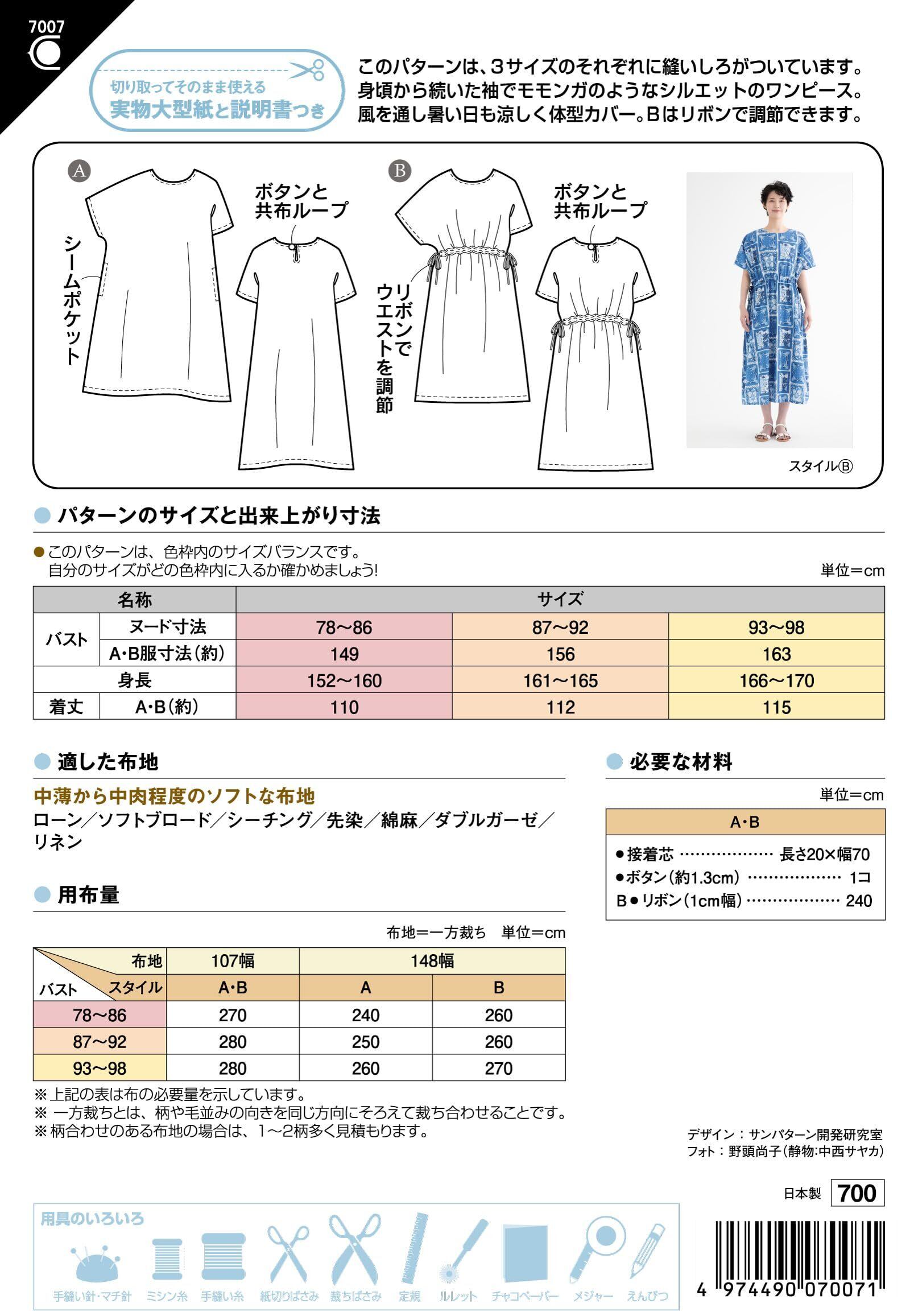 サン・プランニング 型紙 パターン ゆったりワイドワンピース 7007