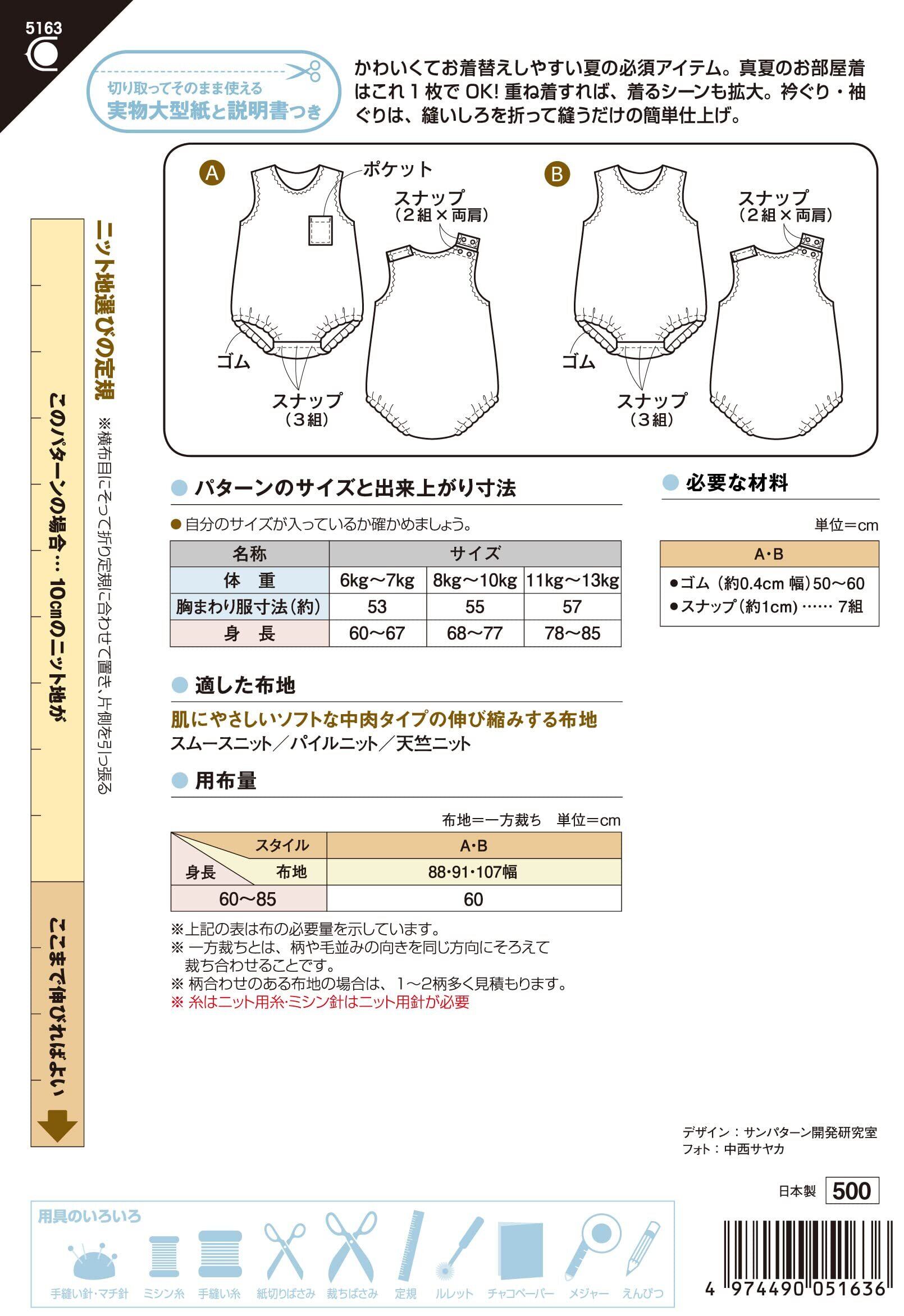 サン・プランニング 型紙 パターン 袖なしロンパース 5163