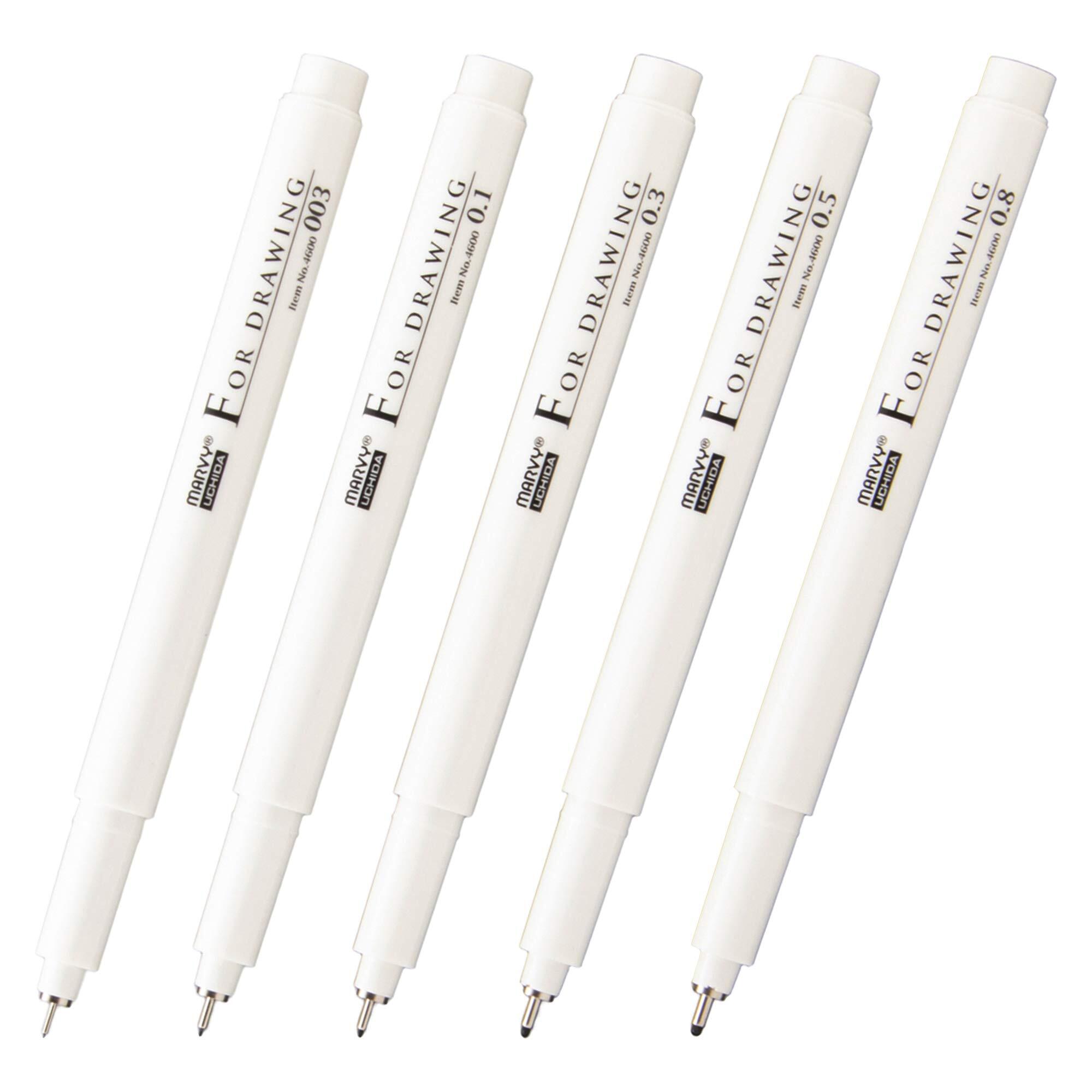 耐水性の水性顔料インクを採用し、超極細0.03mm/0.1/0.3/0.5/0.8mmをセットにしたミリペンのセット。筆圧の強い方向けにしならないよう固めの描き味。イラストなどのペン画やペン入れに。