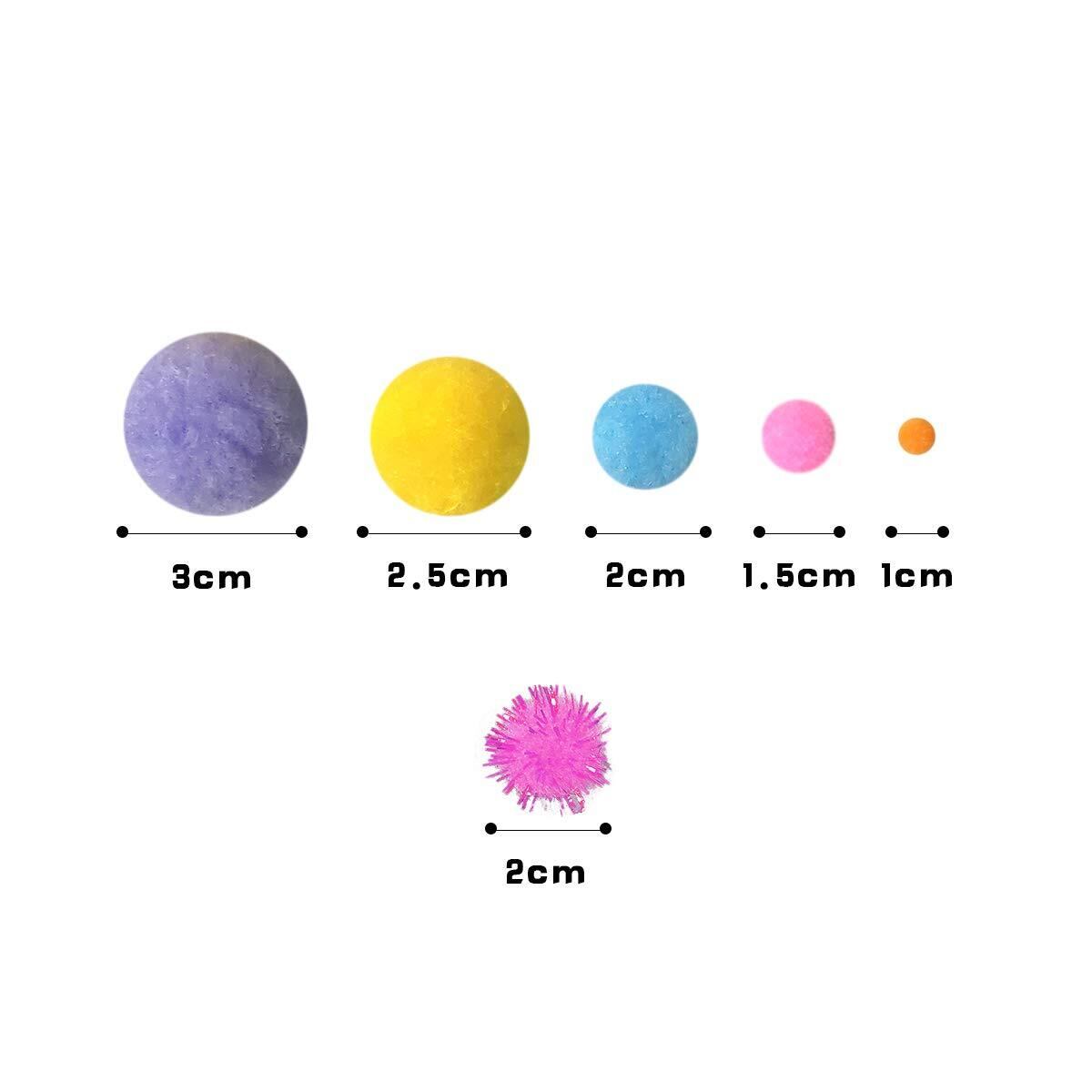 ポンポンボール内容:径1cmx1400個、径1.5cmx160個、径1.5cmx200個(錦糸付)、径2cmx120個、径2.5cmx80個、径3cmx40個。軽量でふわふわしたボール!