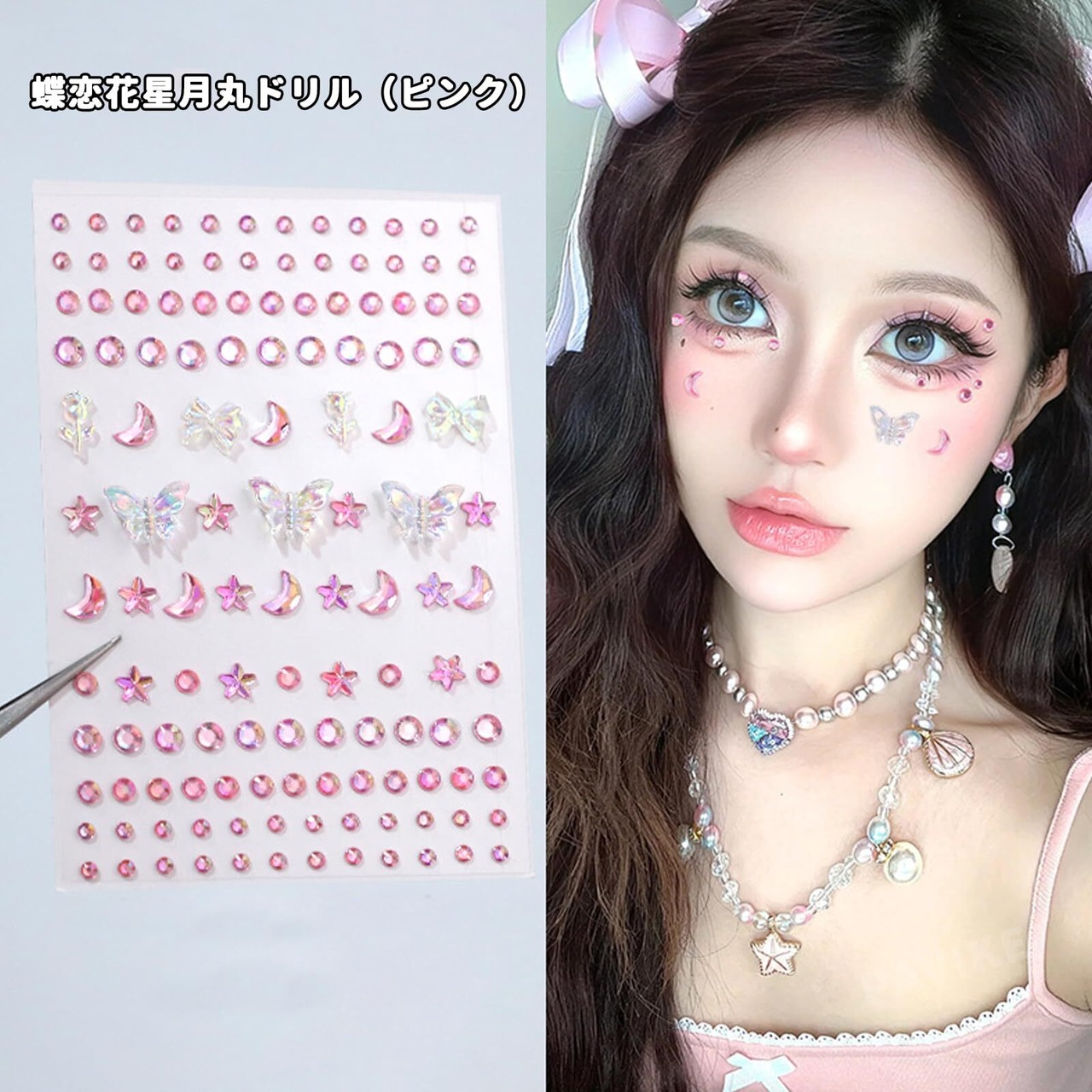 【商品内容】パール調、カラフル、ピンク、パープル、ブルーの5種類に、星、月、蝶、円形のラインストーンが1シートあたり約128個があります。顔、ネイル、携帯電話などの装飾に使用できます。