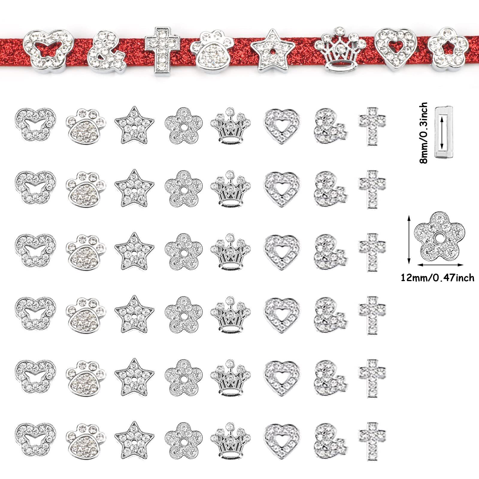 ASUNFO ラインストーンスライドチャームビーズ 48個 アソート8形 王冠 五角形 十字架 花 蝶 & 足跡 ハート 8mm 金属 宝石なし