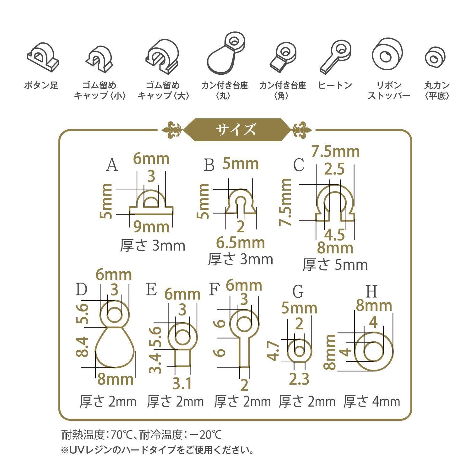 作れるパーツ:ボタン足、ゴム止めキャップ(小)、ゴム止めキャップ(大)、カン付き台座(丸)、カン付き台座(角)、ヒートン、リボンストッパー、丸カン(平底)
