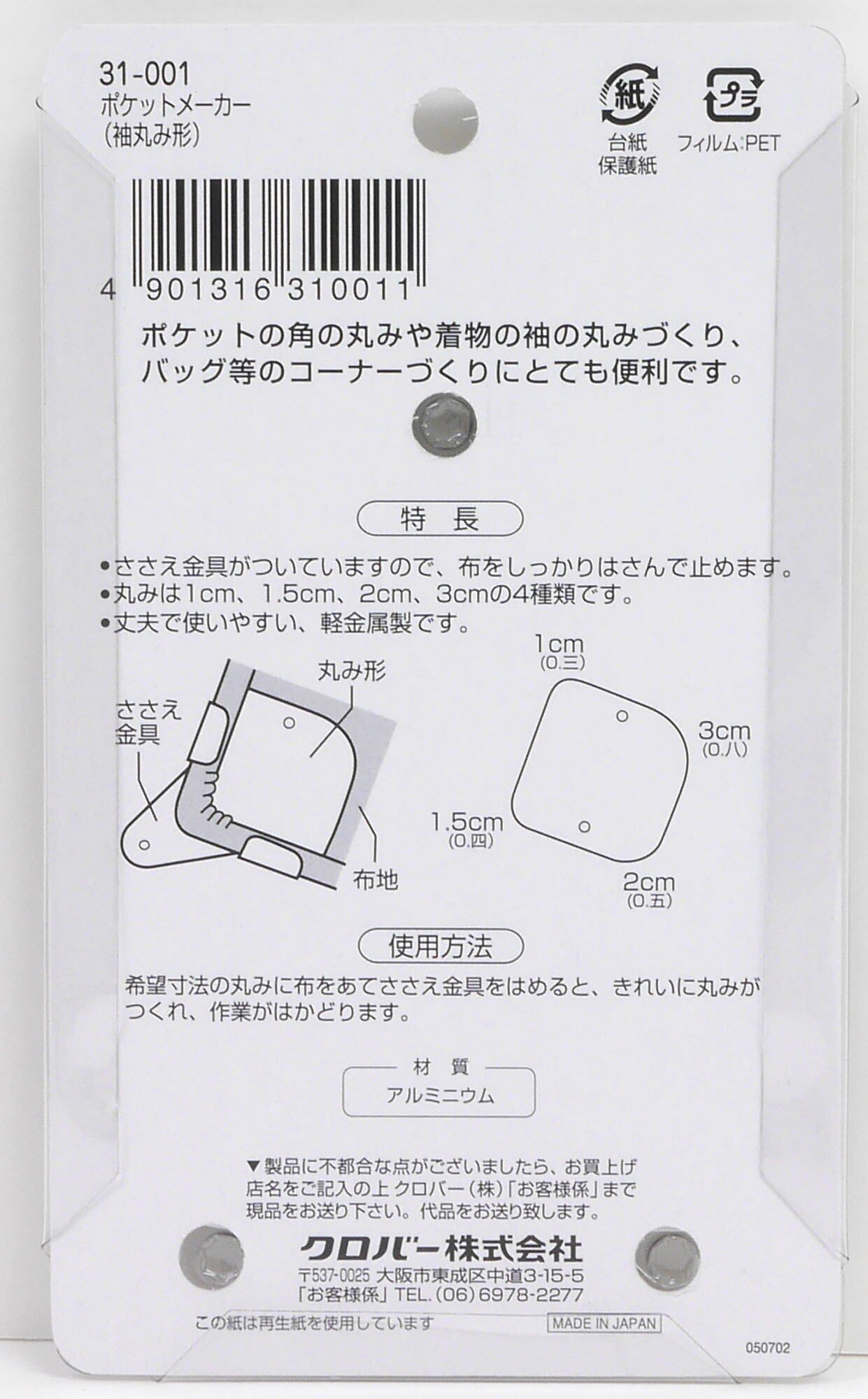 クロバー(Clover) ポケットメーカ 袖丸み形 8.6x14.6x0.9cm 31-001