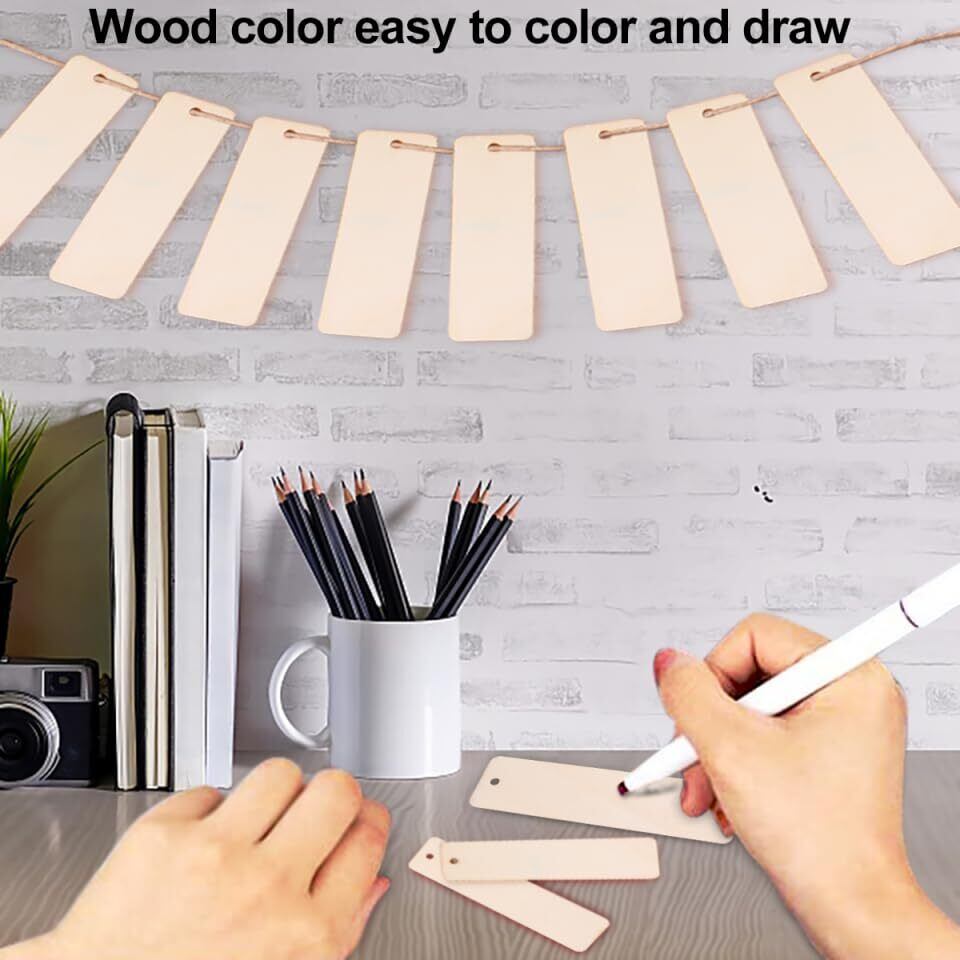 紐付き: 長方形の木製タグにはあらかじめ穴が開けられており、付属の紐でアイテムに結び付けることができます。そのため、ギフトタグ、吊り下げ装飾品、テーブルカードなどとして使用するのに最適です