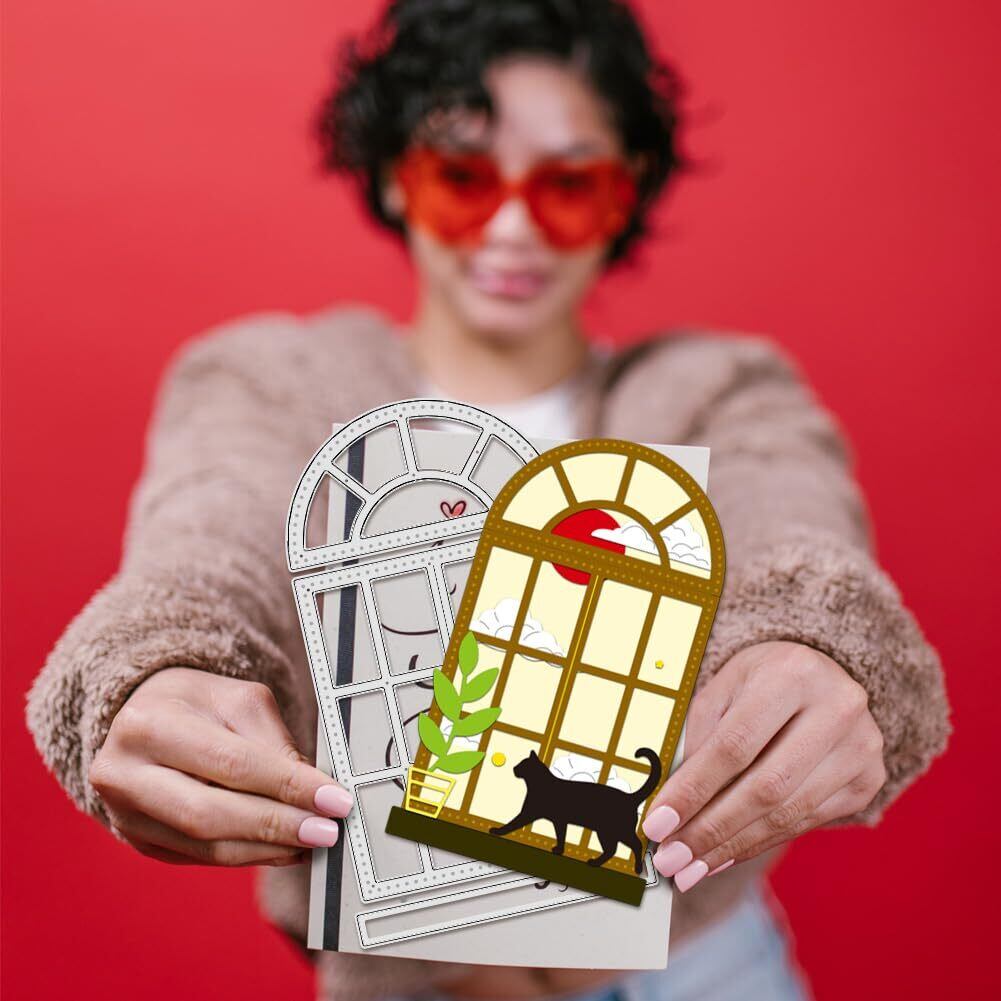 BENECREAT 1セット2枚 カッティングダイ 猫と窓 炭素鋼 ステンシル スクラップブック カード作り ダイカットテンプレート 装飾 DIYフォトアルバム 手作り