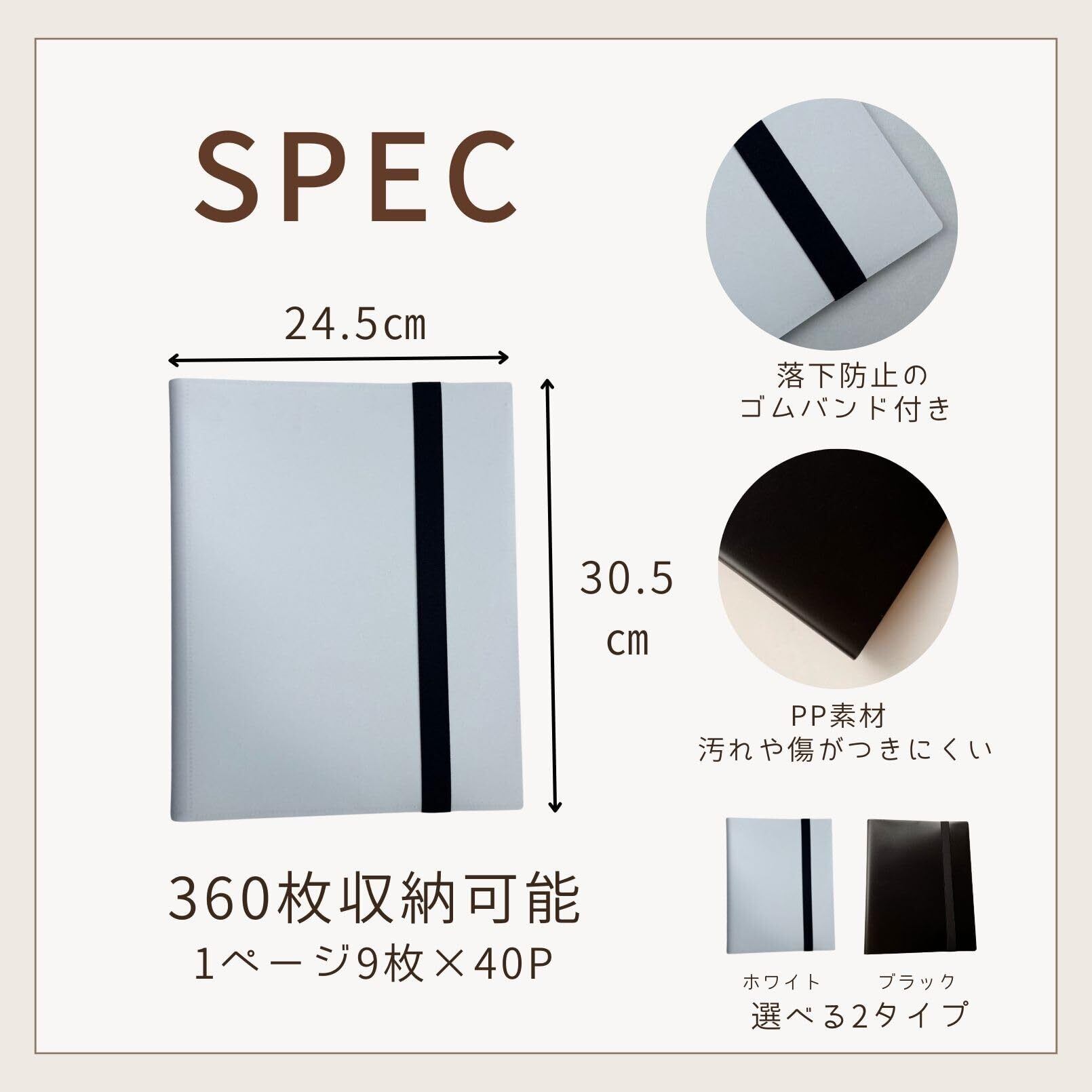 本体サイズ:30.5cm×24.5cm、ポケットサイズ:9.5cm、チェキ収納可能枚数:360枚。カラーはブラックとホワイトの2色展開です。
