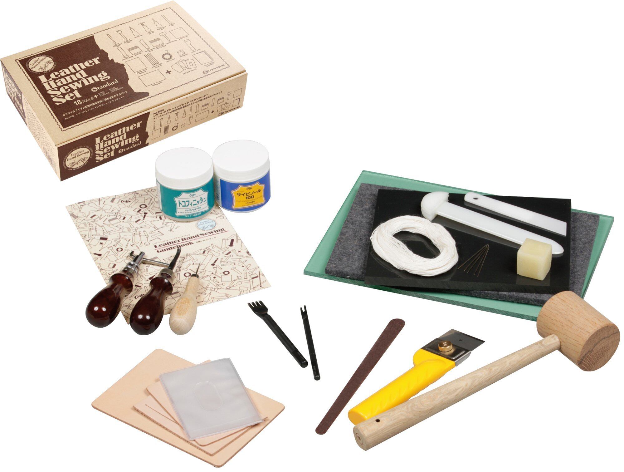セット内容:2本ヒシ目打、4本ヒシ目打、丸ギリ、ステッチンググルーバー、へりおとし、サンドスティック、ヘラ付へりみがき、トコフィニッシュ、ジラコヘラ、サイビノール100番、木槌、ゴム板、フェルト、手縫針、エスコード、手縫いワックス、別たち、ビニール板、カードパスケースキット、ガイドブック