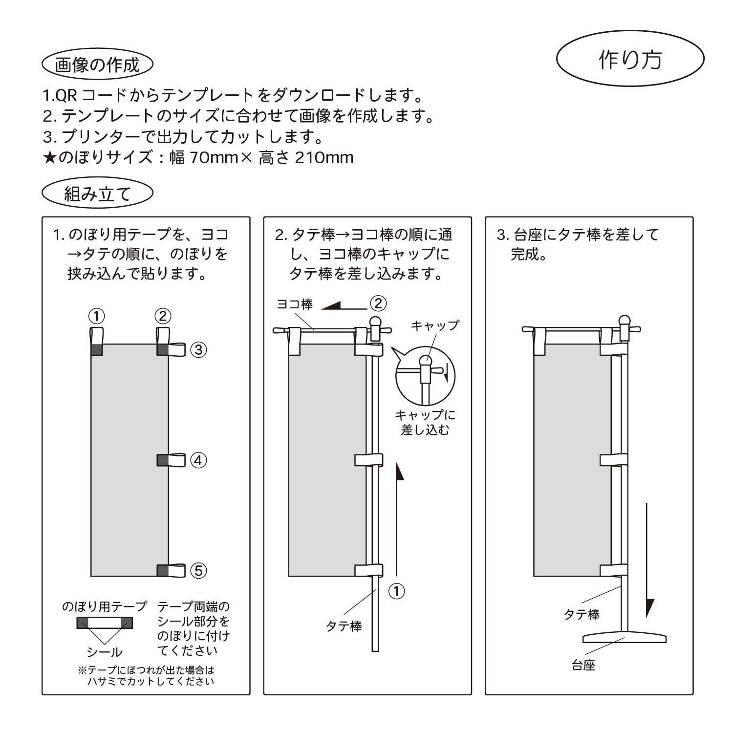 セット内容:ヨコ棒、タテ棒、台座、のぼり用シール5枚×2シート 【ご注意】のぼり部分は付属しておりません。のぼり用シールは生地のため、生地の端がほつれる場合がありますので、ほつれた部分は、はさみでカットしてご使用ください。