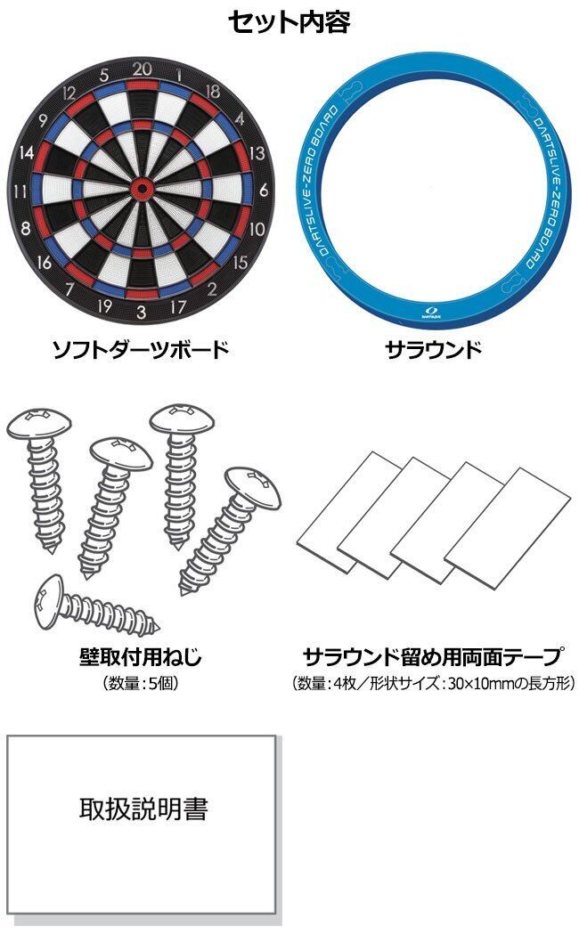 内容物 ・ダーツボード×1個 ・サラウンド×1set ・壁取付用ネジ×5個 ・サラウンド留め用両面テープ×4個 ・取扱説明書×1個
