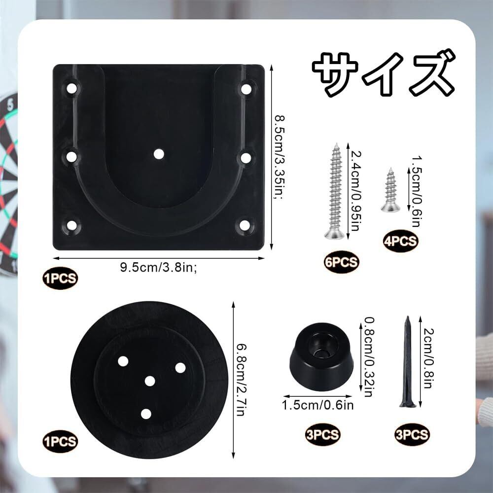 【パッケージ内容】ダーツボード取り付けブラケットキット:1 × ダーツブラケット、6 × 長いネジ、4 × 短いネジ、3 × 釘、3 × クッション、ほとんどのダーツボードに適用可能。