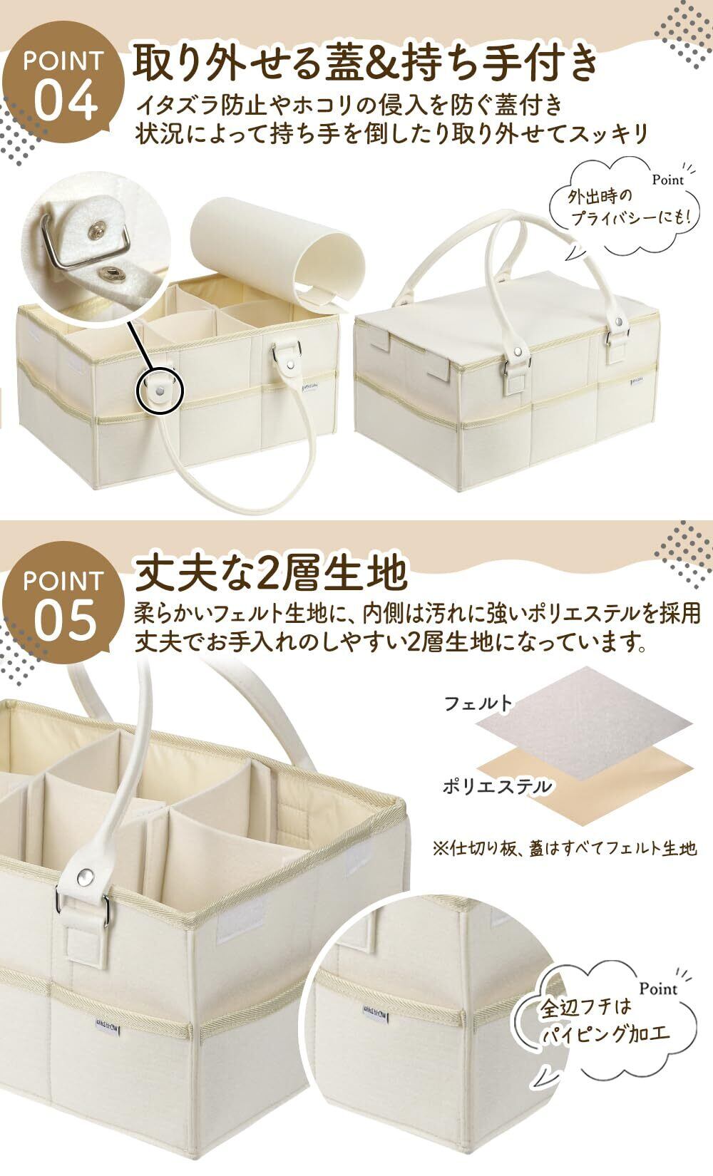 【商品仕様】サイズ(約):横38cm×縦25cm×高さ18cm 重量(約):500g(フタ、仕切り含む) 素材:フェルト(内側 ポリエステル)