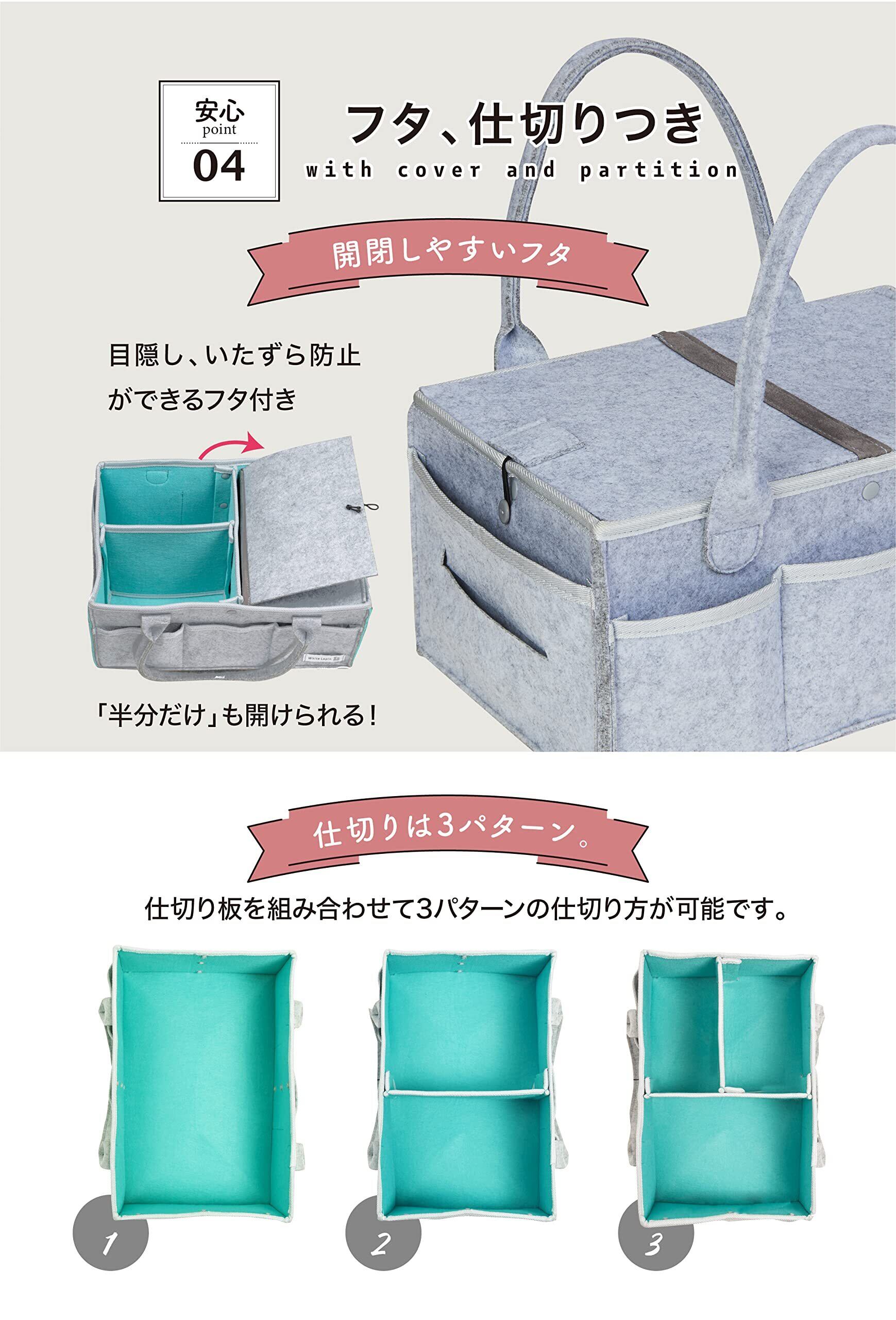 【軽くて丈夫な作り】両面と二重軽量で耐用性があるフェルト素材で作られておりオムツ収納ケース、柔らかい感触で、子供が触っても安全です。しっかりした底板が入っているから、厚みがあって、形がくずれにくく、重たいものでも安心して入れられます。 【多用途】幅約38.5×奥行約25×高さ約18cm;スペース:(内側)仕切り×5+(外側)ポケット×8。ハンドルも付きなので、ベッドレールまたはバスタオルレールに掛けて使うこともできます。家庭で使用するだけではなく、車内用、アウトドアやピクニックの時に食品の収納などもご利用頂きます。