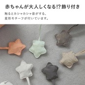 【赤ちゃんが大人しくなる!?飾り付き】 触るとカシャカシャ音がする、星形モチーフが付いています。このカシャカシャという音は、お母さんの胎内音に似ているんだとか。個人差はありますが、赤ちゃんにカシャカシャを握らせてあげると、おむつ替え中も気が紛れて大人しくしてくれるかも。
