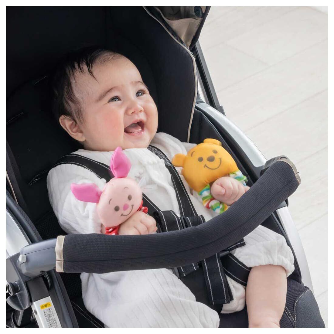 赤ちゃんの足につけるとシャラシャラ音が鳴る、くまのプーさんとピグレットのラトル。 まだ物をつかめない赤ちゃんにもおすすめです。