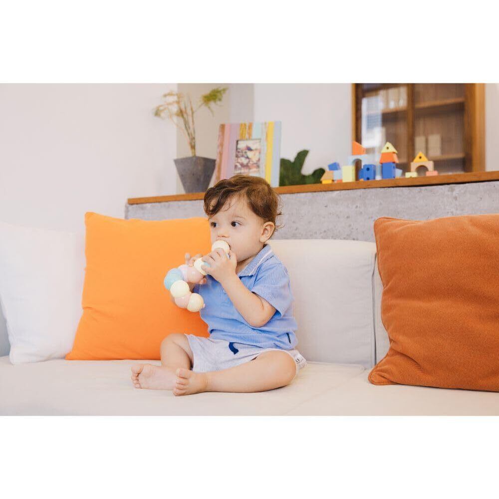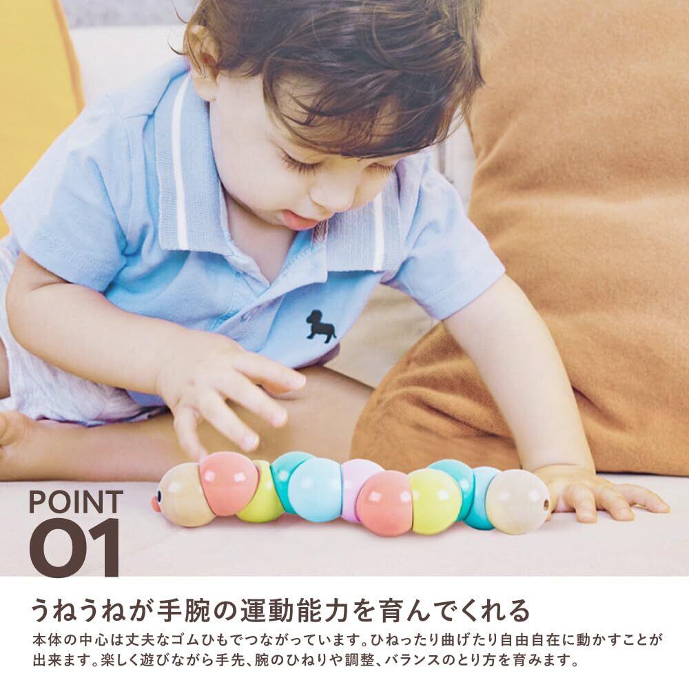【知育玩具におすすめ ②】色鮮やかなイモ虫さんラトル。様々な色に触れることは色彩感覚を養い、お子さまの感性を育みます。