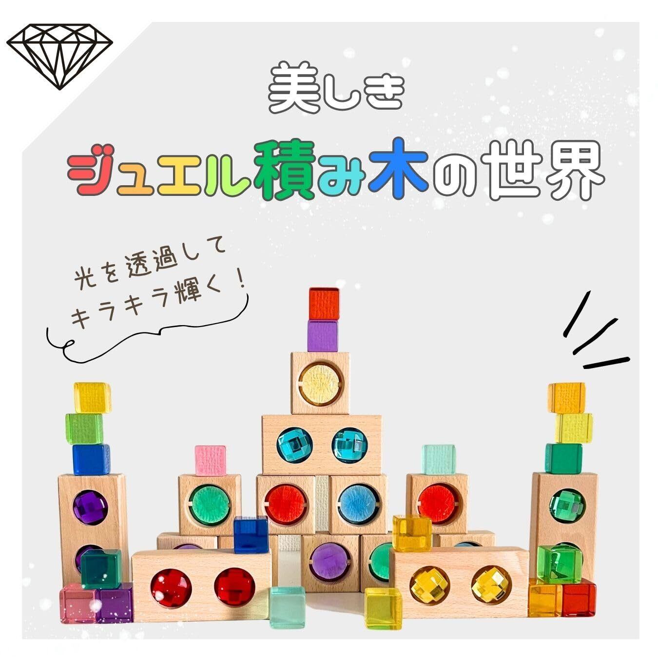 SNSで大人気 美しい色彩や柔らかな木のぬくもりを感じるジュエル積木です。積木に光を当てると、光が積木を通して鮮やかな反射を生み出します、子ども達に魔法のような瞬間を与えます。インテリアとしても美しくお部屋を彩ります。