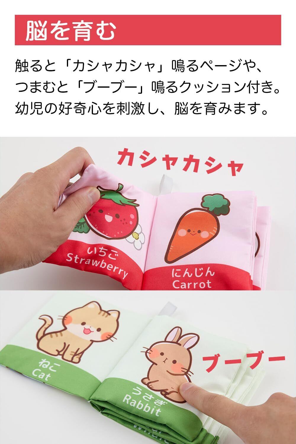 【脳を育む】触ると「カシャカシャ」鳴るページや、つまむと「ブーブー」鳴るクッション付き。幼児の好奇心を刺激する仕組みが満載の絵本です。