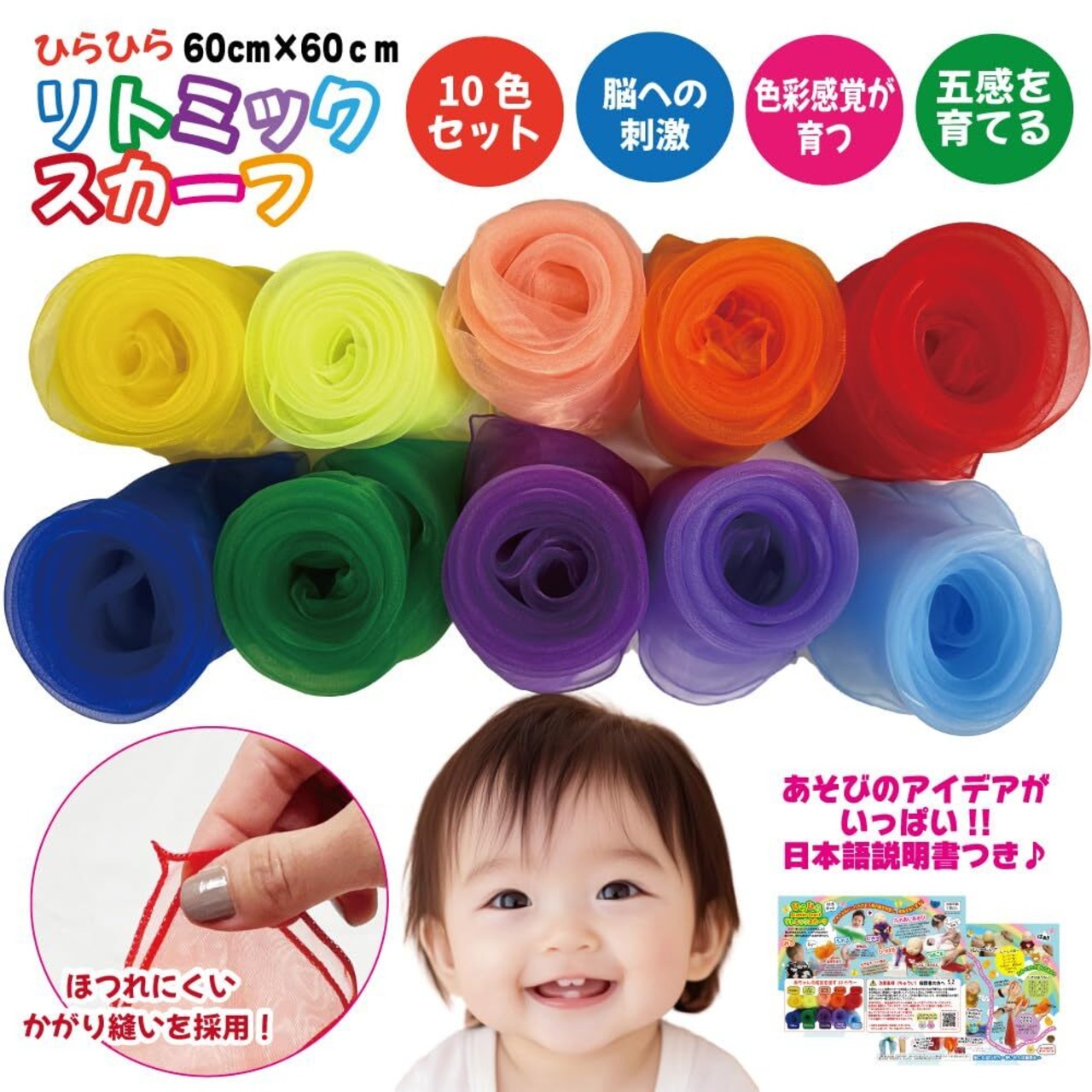 【リトミックスカーフ おすすめポイント】小さい頃にたくさんの色を見ることで脳に刺激を与えます。しっかり色彩感覚が身に付き、様々な感覚から五感が育ちます。スカーフで遊びながら、優しく声をかけたり頬笑んだり目を合わせたりすることで、お子様の心の成長や安心感を培うことができます。