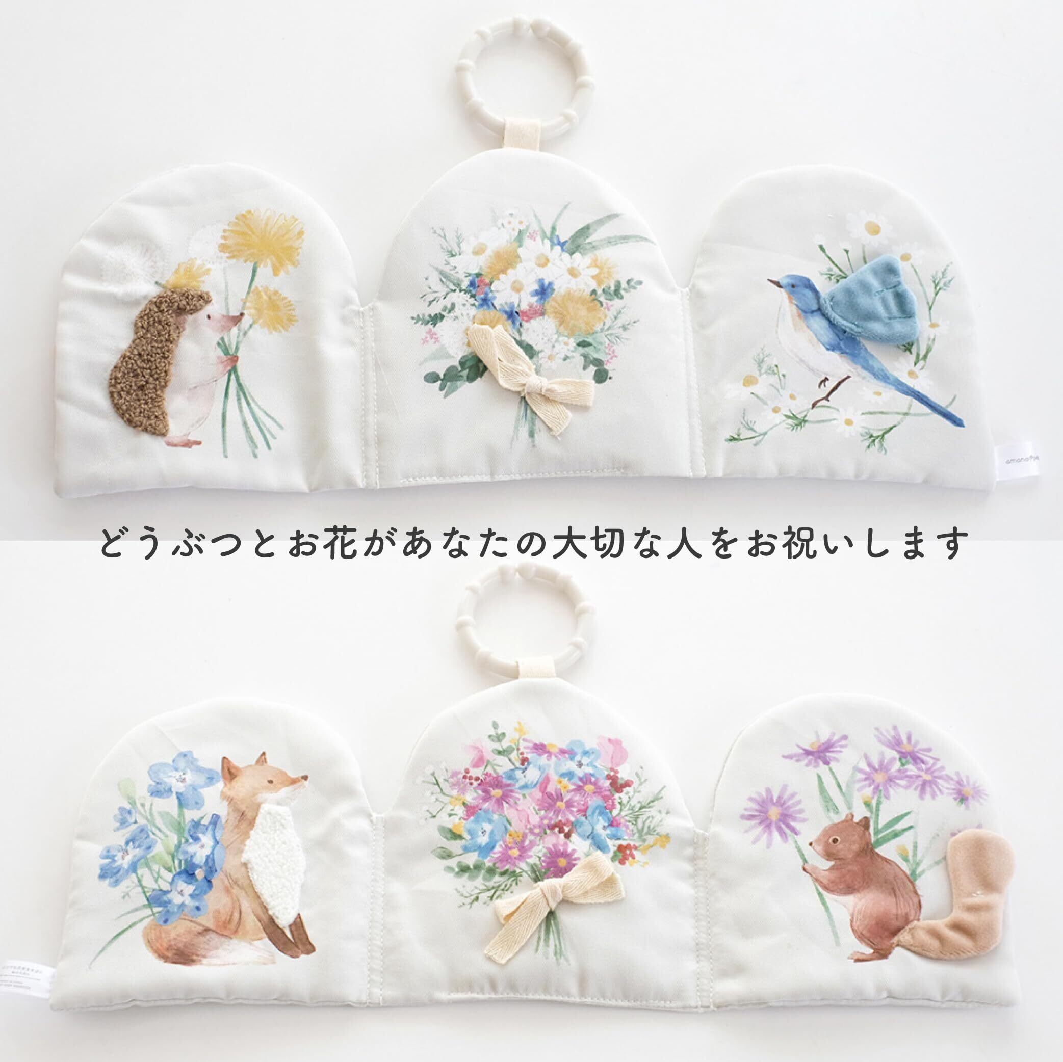 ・大切な人への想いを 花々にのせてamanoppoが伝えます お祝いの気持ちが込もった花束のように、大人も貰って嬉しいデザインに仕上げました。 えほんの中心に描かれた花束は、cocory friendsのどうぶつたちがそれぞれ運んできたもの。 「幸福」「癒やし」など赤ちゃんとママへのエールになるような花言葉を持つお花を選びました。 ・赤ちゃんにも嬉しい仕掛けもたくさん どうぶつたちの体の一部がもふもふの生地になっていたり、 めくったり、パリパリの音で楽しく遊ぶことができる赤ちゃんにも嬉しい仕掛けえほんです。 大きくなったらリボンを結ぶ練習にも使えたりと、永く遊べます。 ・“お部屋に飾る” も意識して お部屋に生ける花を見つめる時のように、 育児の合間にママもほっと心がゆるむような心地よい時間を送って欲しい… そんな思いで、このぬのえほんは生まれました。 ぬのえほんはお気に入りのページの向きに飾ったり、 立てておくことができます。