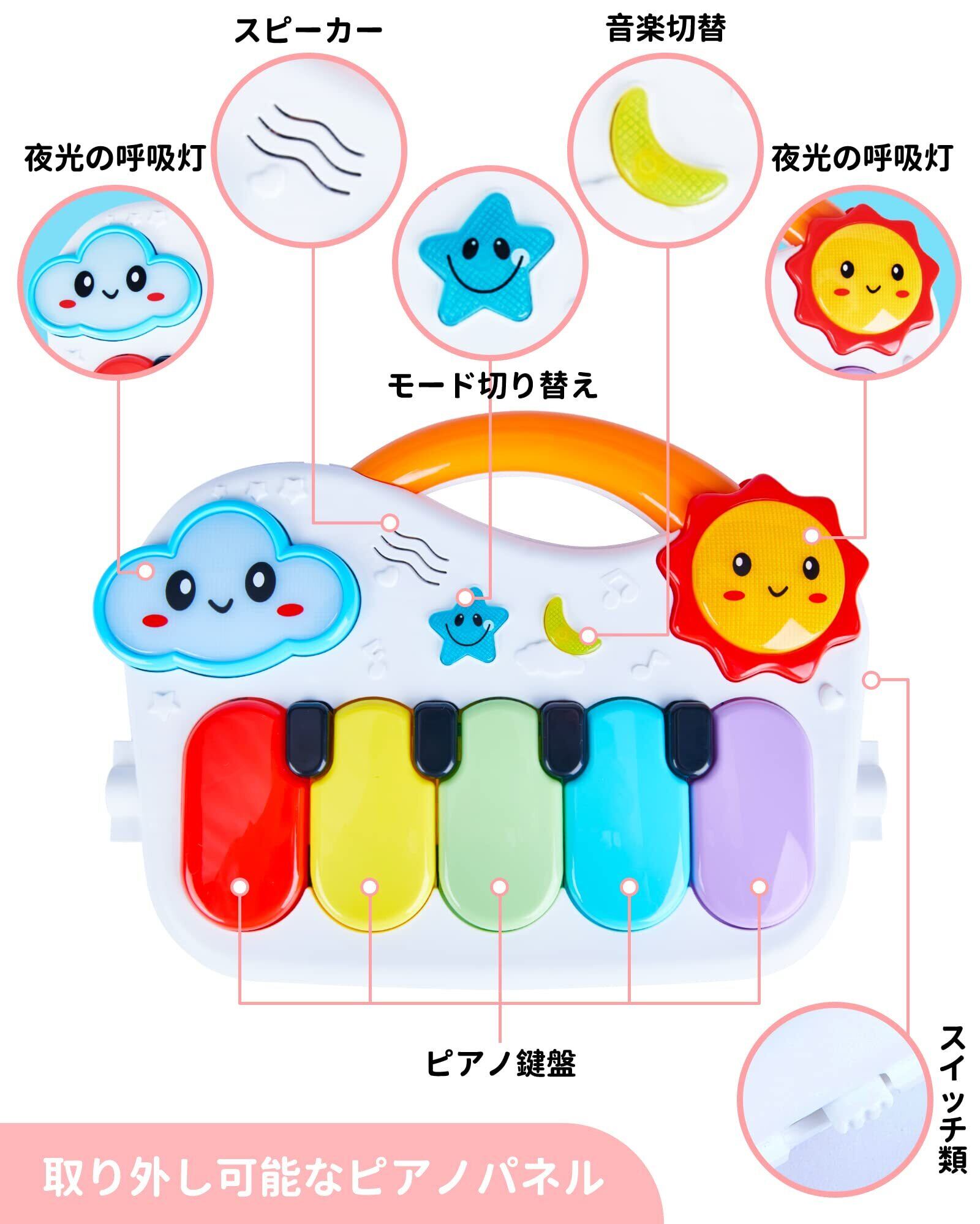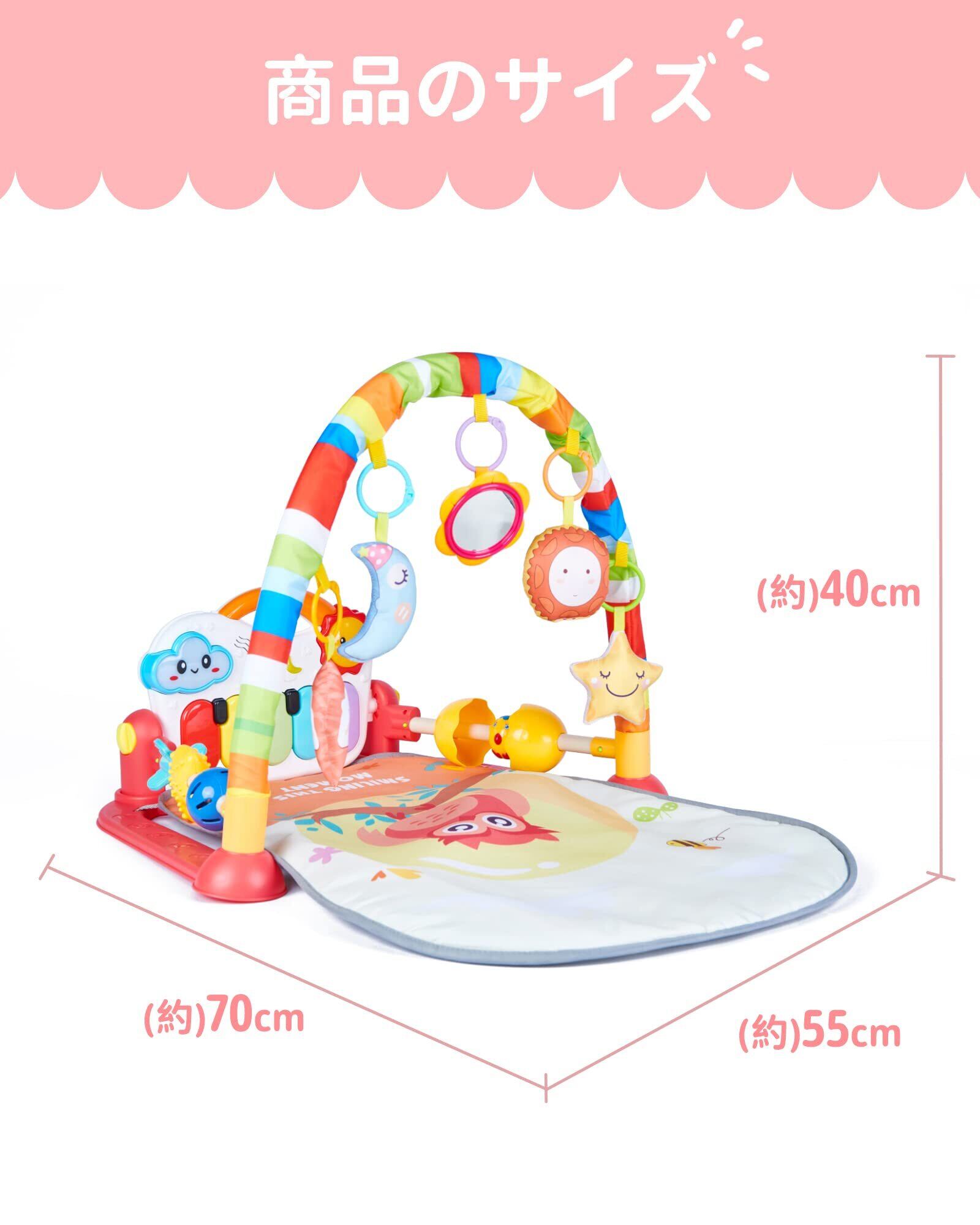 【赤ちゃん用プレイマット】:ベビージムはアーチとおもちゃは取り外しができて、5つのおもちゃ仕掛けでお子様の成長を促すいろいろな遊び方ができます。赤ちゃんが足でピアノを蹴ると音がして運動機能が向上します、優しくてゆっくりとした音楽を流して、赤ちゃんのために楽しい成長雰囲気を作り出します。