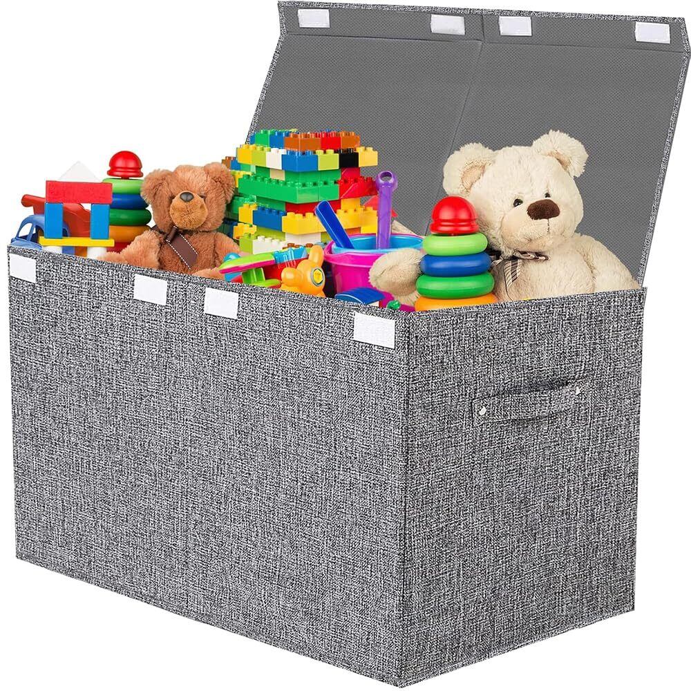 【折りたたみ式おもちゃ箱】取り外し可能なフリップトップの蓋が付いたこのおもちゃ箱収納は、収納物へのホコリの侵入を防ぎ、使用していないときは平らに折りたたんで簡単に保管または持ち運ぶことができます